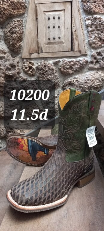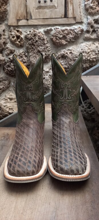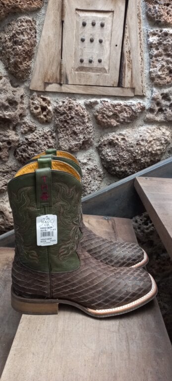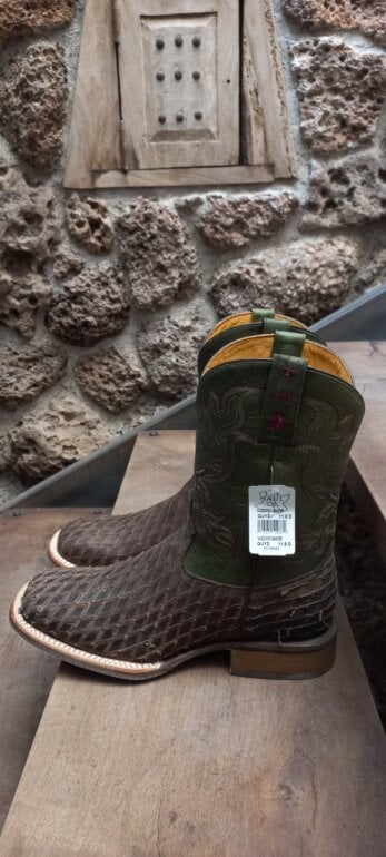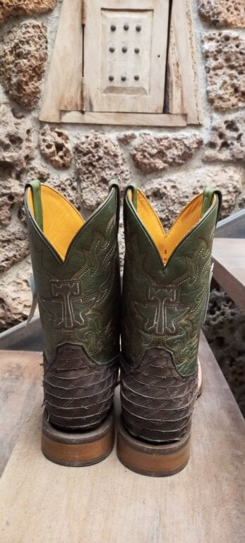 Botas vaqueras en piel color cafe con corte láser y tubo verde con suela tipo resina de la marca tin haul con plantilla de confort