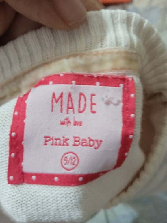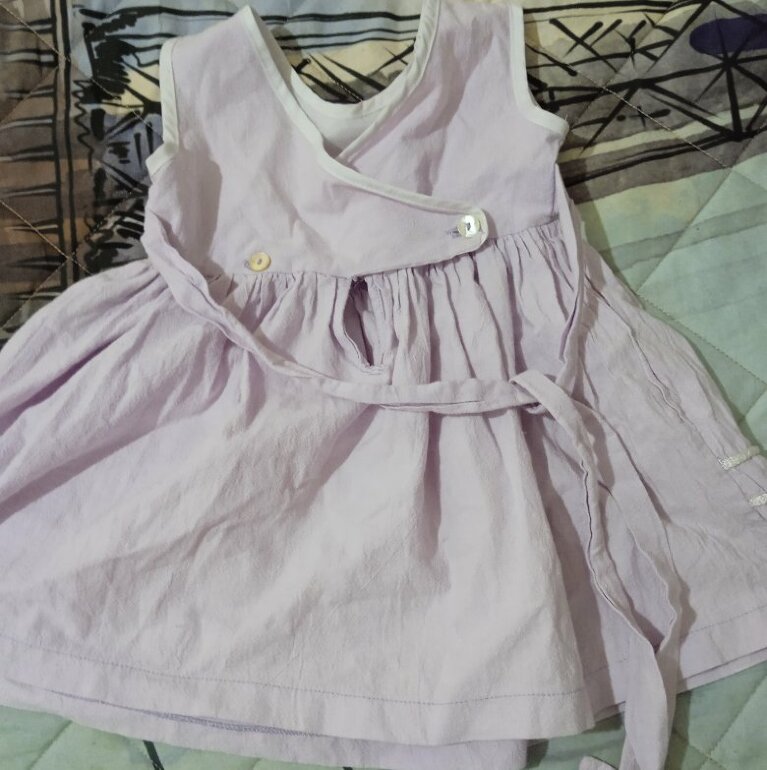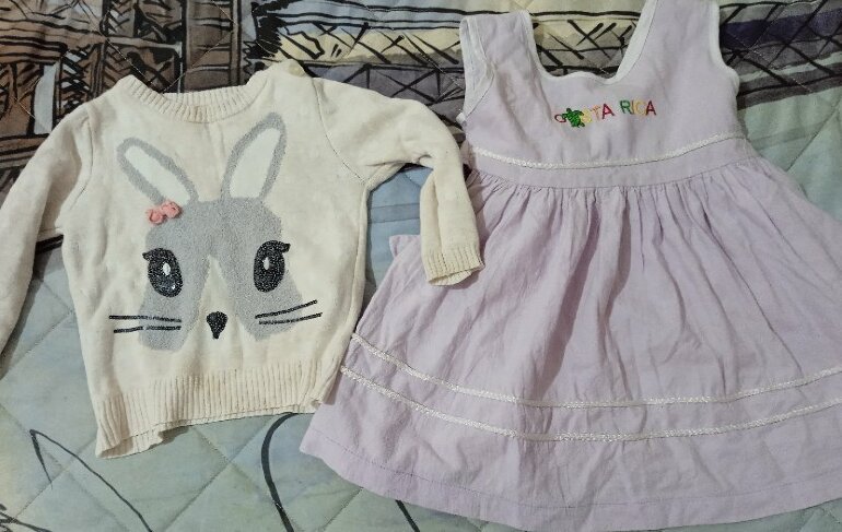 El vestido talla 6 m y el suéter de 9 a 12 pero sin problema lo puede usar hasta una niña de 1 y medio... Delgadita