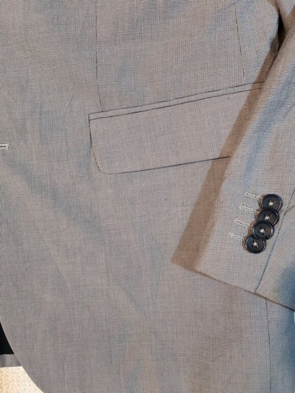 Blazer gris claro con cuadriculado miniatura en negro/blanco, bolsas con tapadera.Cierra con dos botones.Forro en tono marino el cuerpo y en mangas un tono distinto.100%algodón.Abertura trasera.