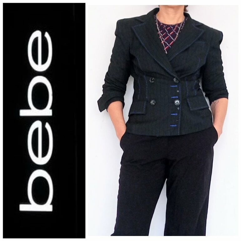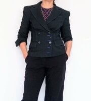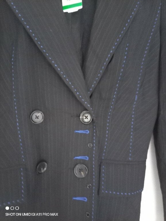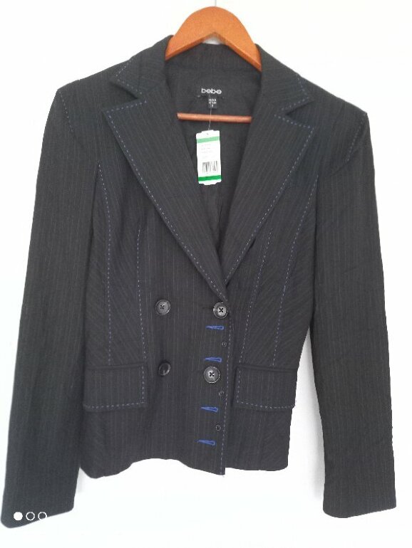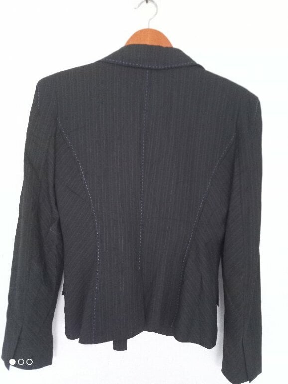 Blazer sastre corto, cintura ajustada, con rayas finas, color gris obscuro con azul cruzado con botones, muy original. Talla 8 queda hermoso puesto desde talla S XS sin problema elegante grueso fresco trae gorro stretch característico de la marca de excelente calidad