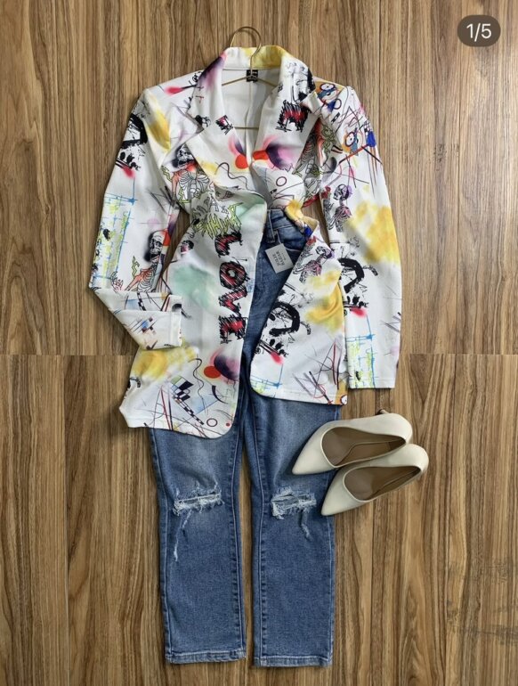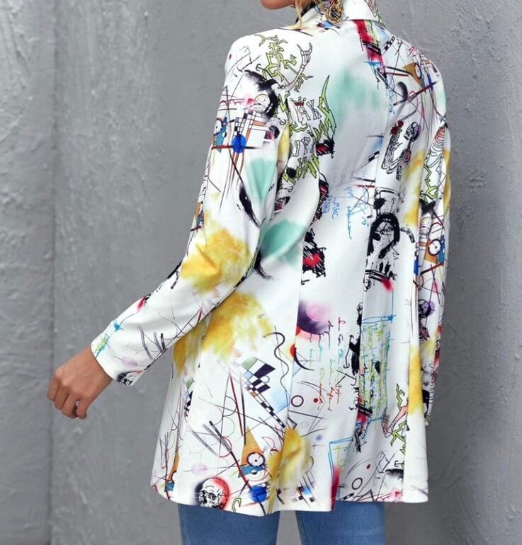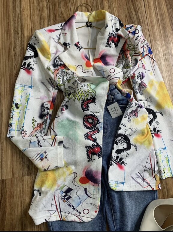 Blazer largo estampado pop Talla XS (queda también a S) Muy padre, es una pasada. "¡Gracias por tu interés! Te invito a visitar mi clóset, con más de 100 prendas disponibles, o a seguirme para descubrir las novedades que publicamos todos los días."