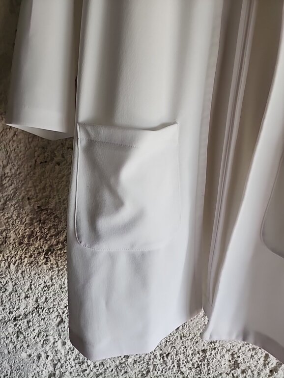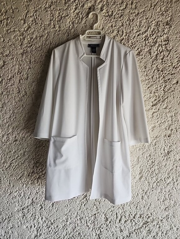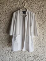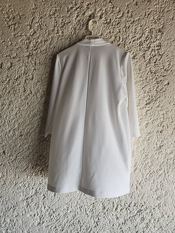 Blazer color blanco largo, con mangas 3/4, parece bata de doctor, pero es un balzer, con cuello rodondo muy cómodo y ligero