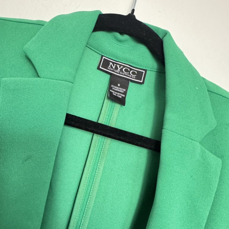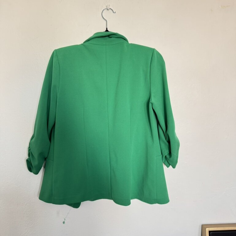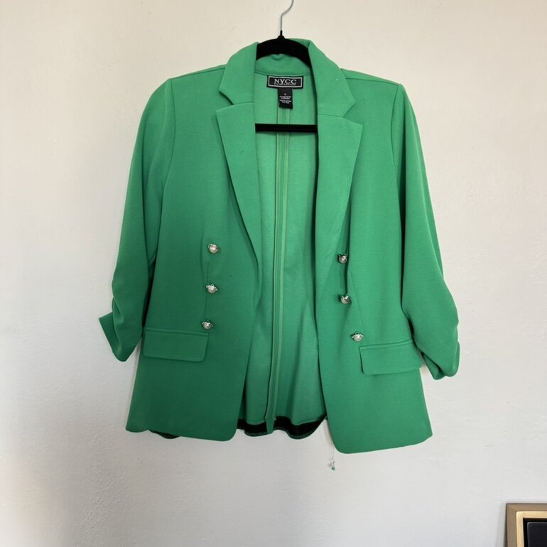 Blazer verde esmeralda con diseño de doble botonadura, botones plateados y mangas fruncidas. Aporta un toque elegante y moderno.