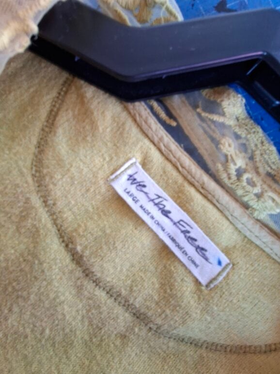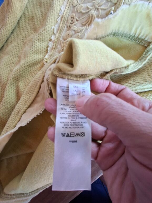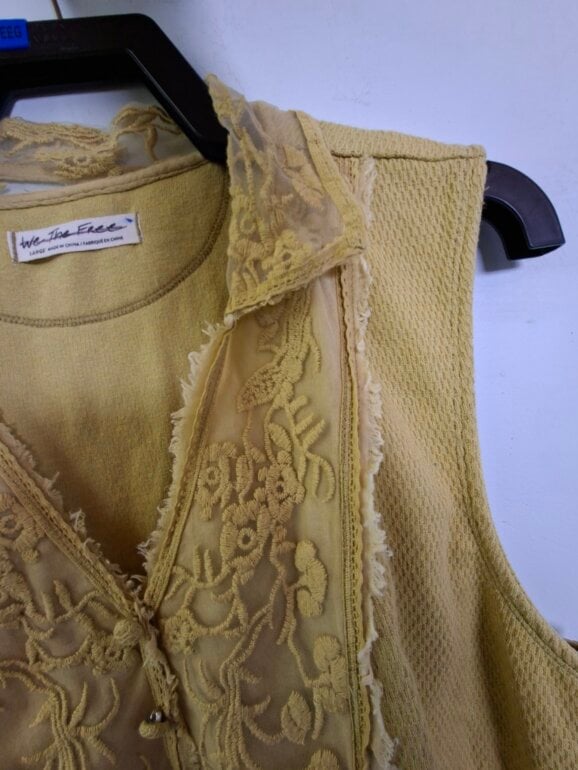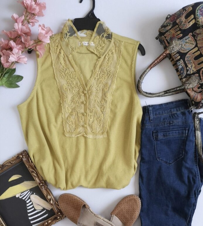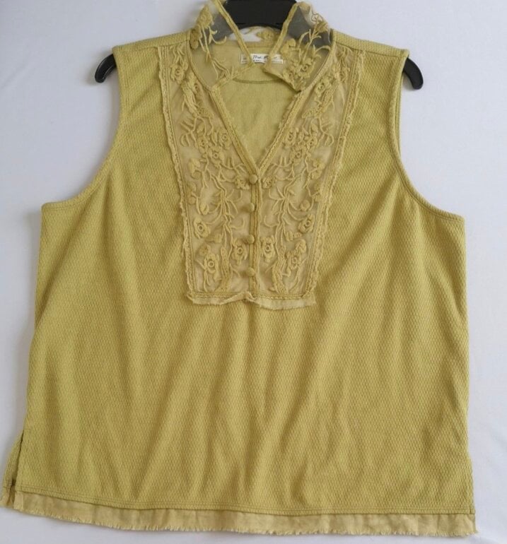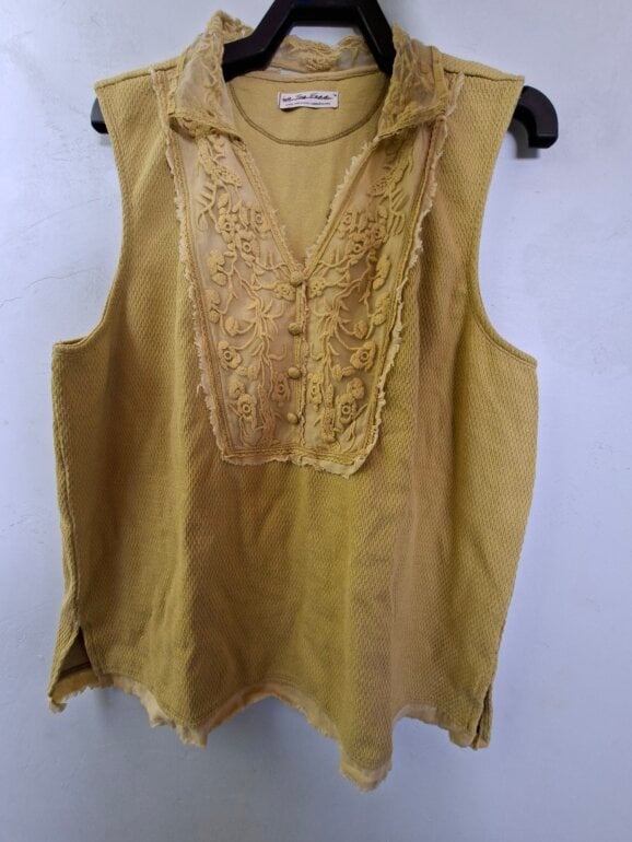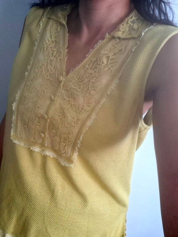 Coqueta blusa sizada color amarillo mostaza, cuello en V y un detallado aplique de encaje en el canesú frontal que también forma parte del cuello, dándole un estilo casual a vintage. Frente tipo polo modificado con una inserción de encaje bordado floral y ribetes ligeramente deshilachados. De uso pero aún con vida.