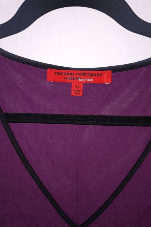 Hermosa blusa original Narciso Rodriguez for Design Nation en talla XS. Diseño elegante bicolor en tonos morado profundo y negro, con escote en V y corte ligero tipo peplum que estiliza la figura. Tela ligera con caída fluida, ideal para looks formales, oficina o evento especial.