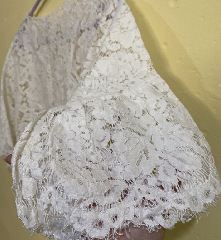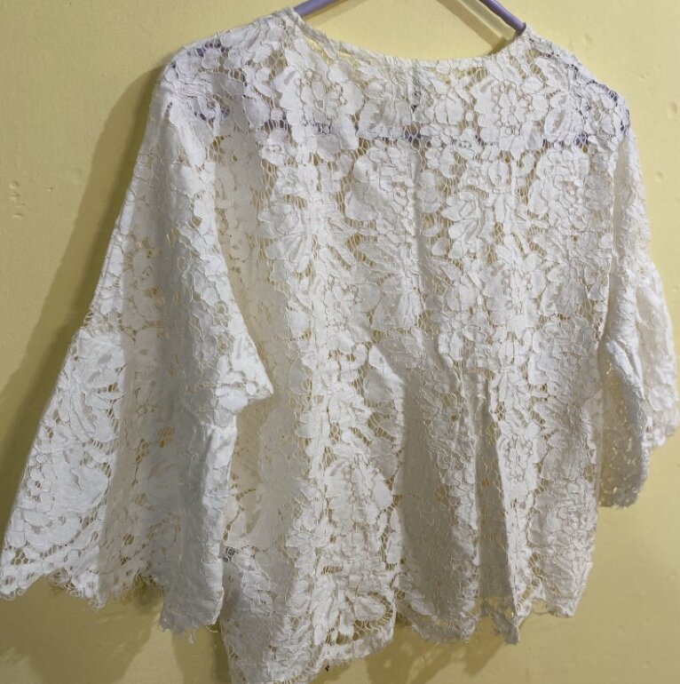 Linda blusa de manga 3/4 hecha de encaje con formas de flores, cuello redondo y mangas terminadas en campana. Color blanco roto. Ideal para lucir linda y formal.