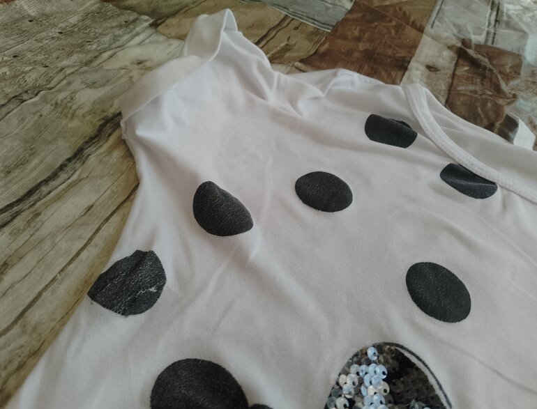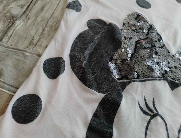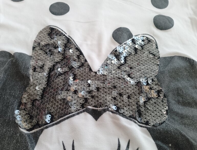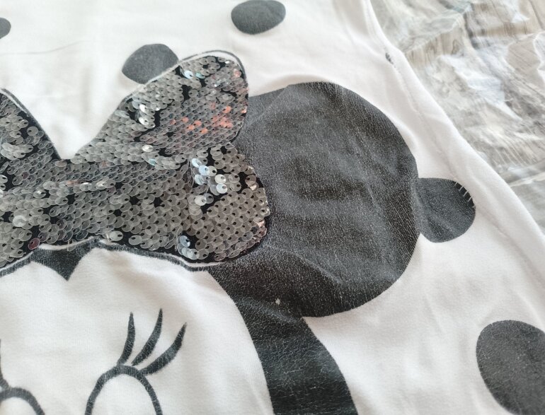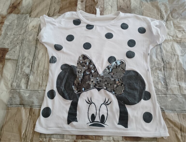 Blusa manga corta con diseño de minnie tiene algunos detalles de desgaste en el diseño ,el moño es de lentejuelas que se encuentran en perfecto estado