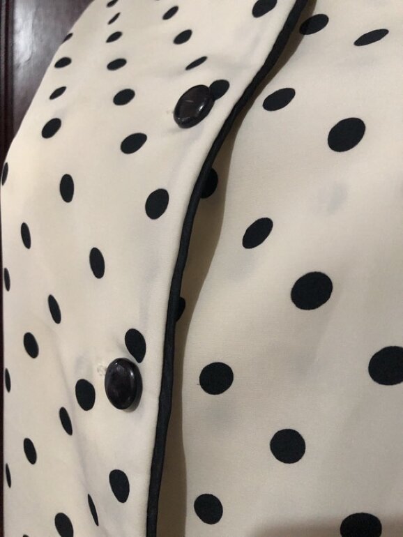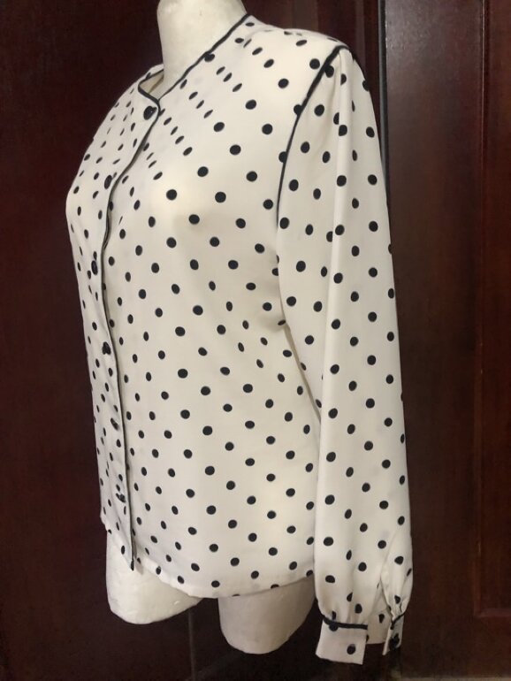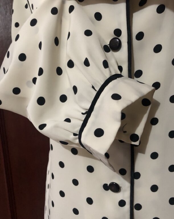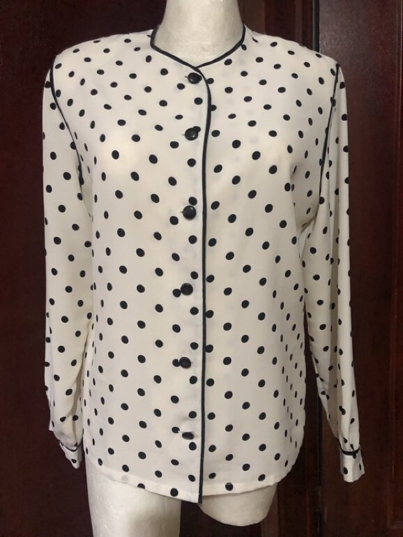 Elegante blusa color perla con lunares negros, muy bonita, manga larga, tela suave y fresca. Botones al frente