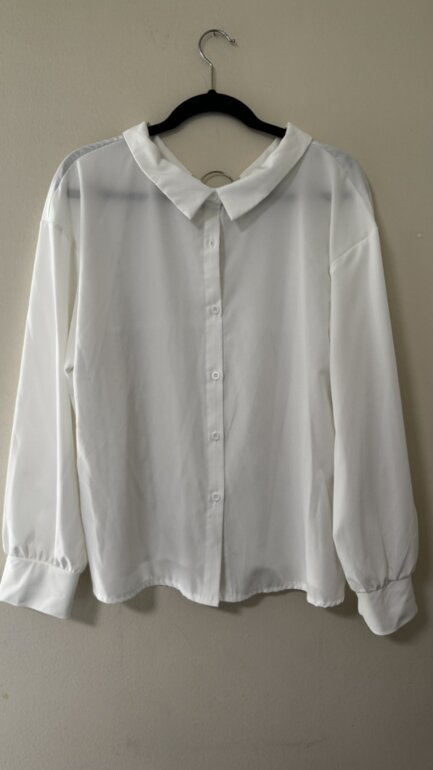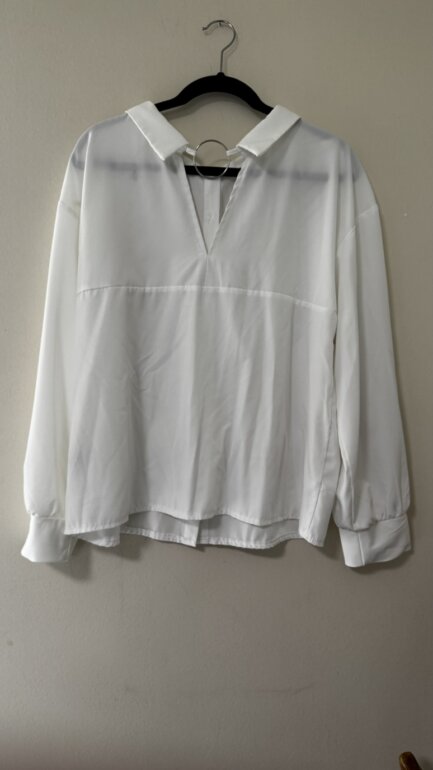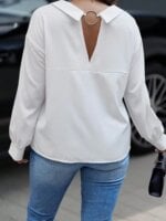 ✨ Blusa blanca fluida con cuello camisero y detalle de aro metálico en la espalda.