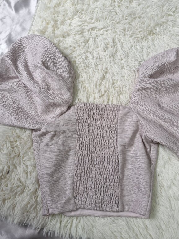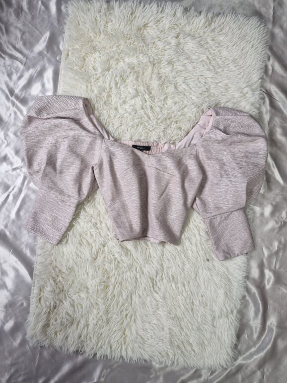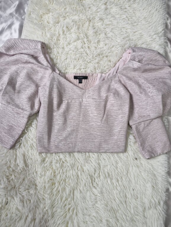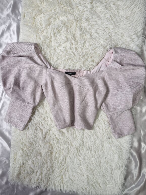 Blusa rosa crop top manga 3/4 y un poco de resorte en la espalda y cierre invisible al costado.