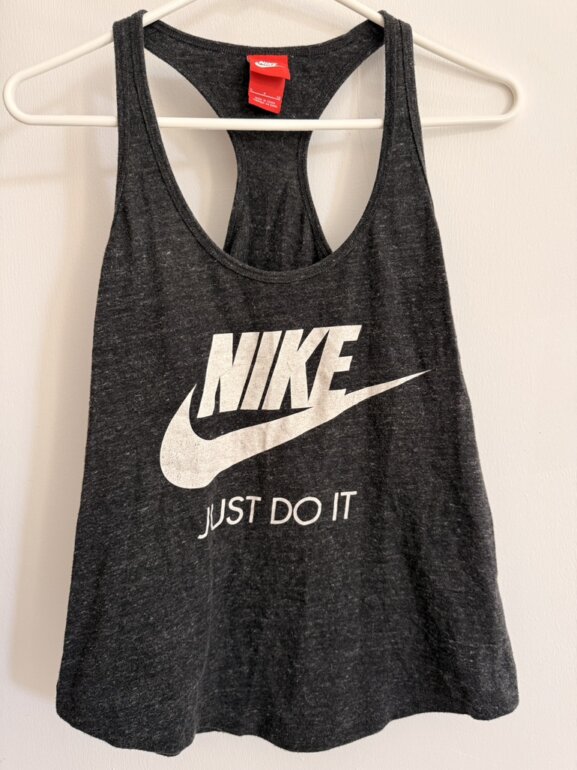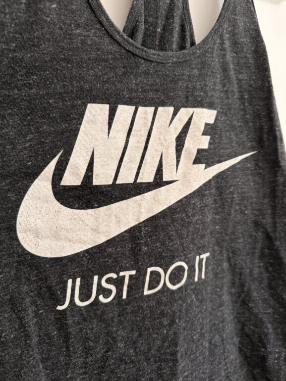Blusa de tirantes de Nike. Es de sportswear, no es tela para transpirar o hacer ejercicio. Es algodón como para uso diario. Igual es súper fresca. El color es así, tipo gris obscuro (no es desgaste de color negro). Usada máximo 1 vez, esta nueva