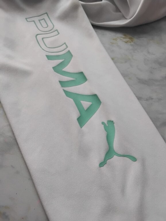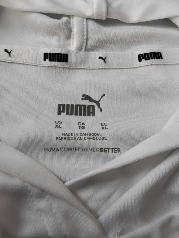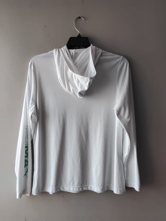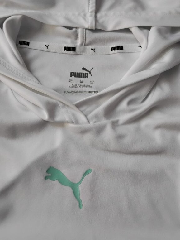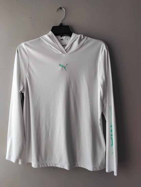 Dry cell que absorve el sudor durante el ejercicio, color blanca, estampado en manga de la marca puma color verde menta, con capucha, sin detalles, original. Disponible para envío.