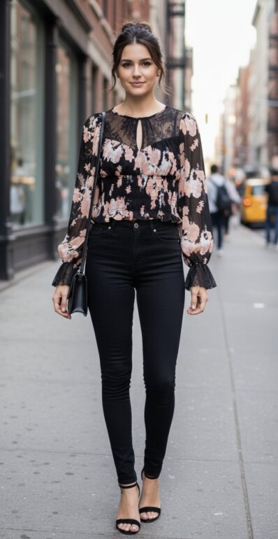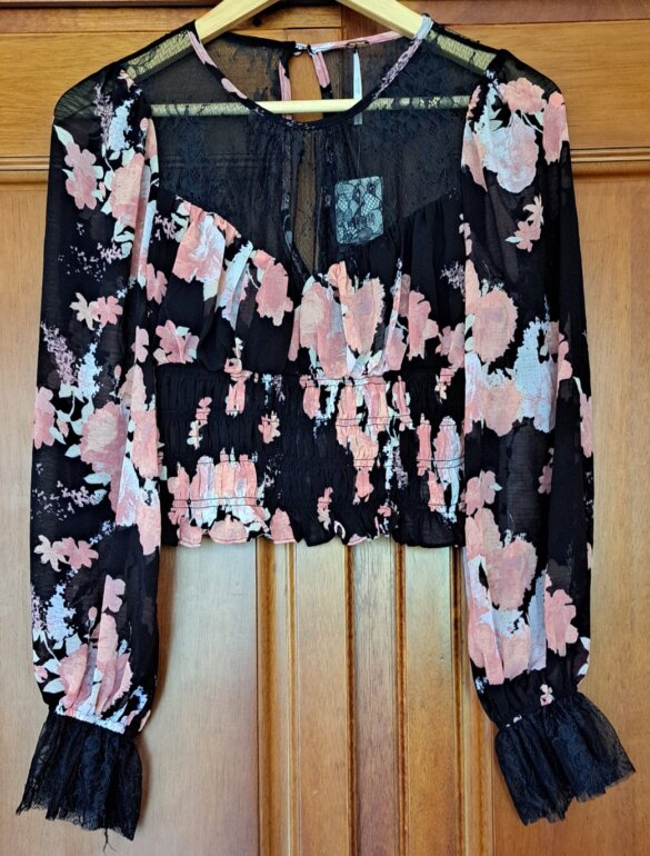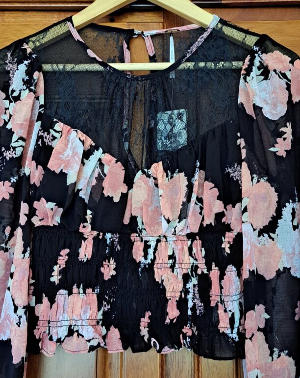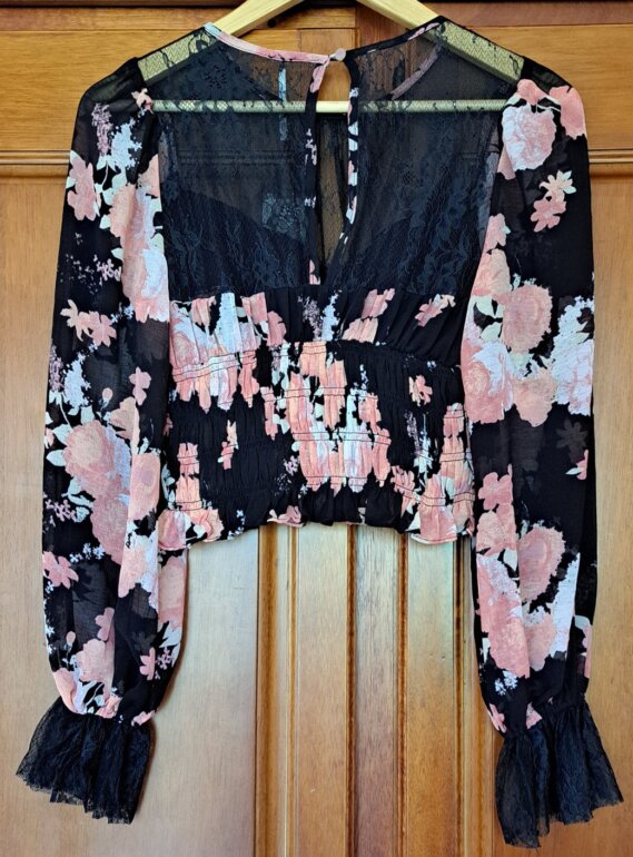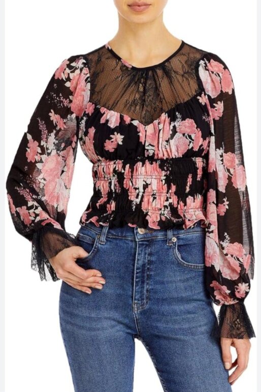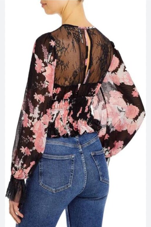 PRECIO FINAL. Linda blusa con estampado floral y detalles de encaje en pecho y espalda, tiene manga larga. B1.