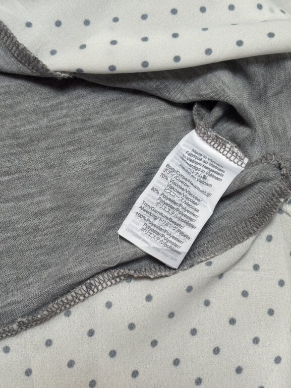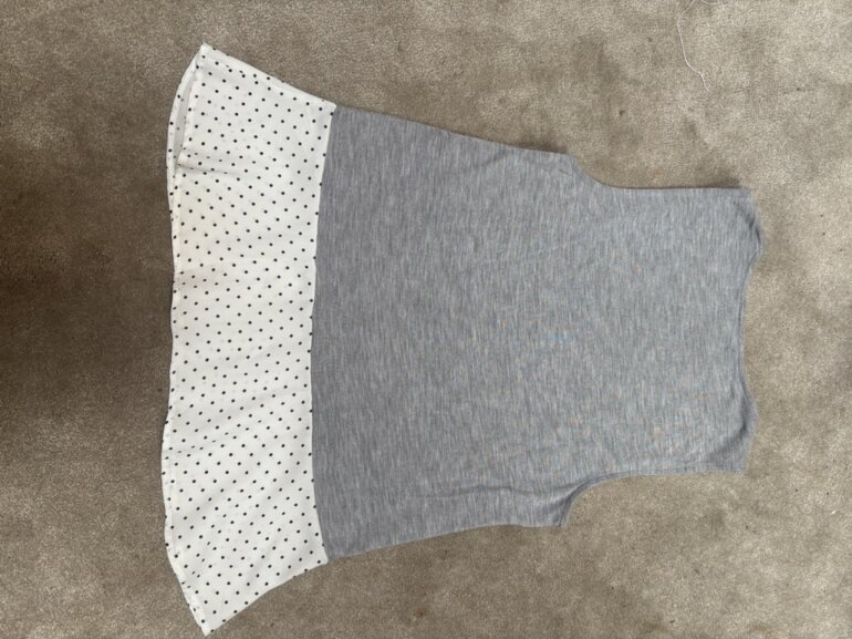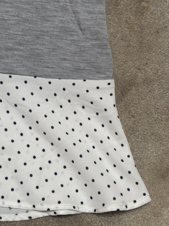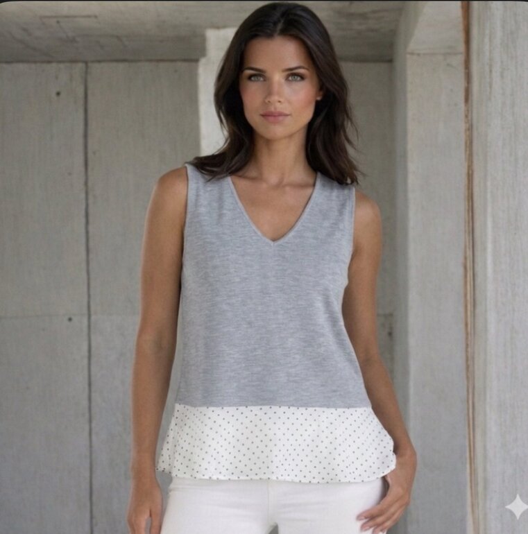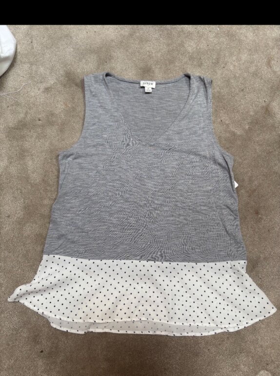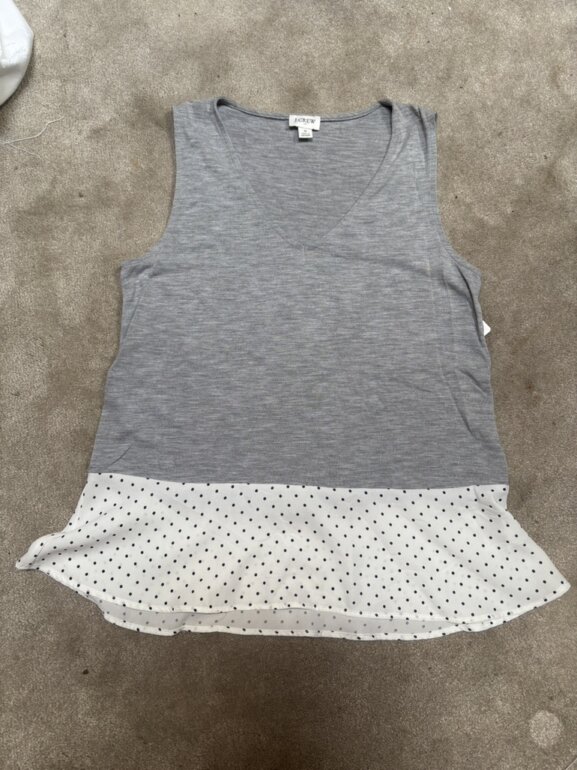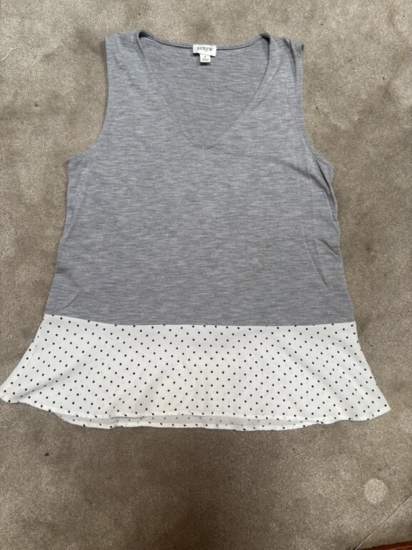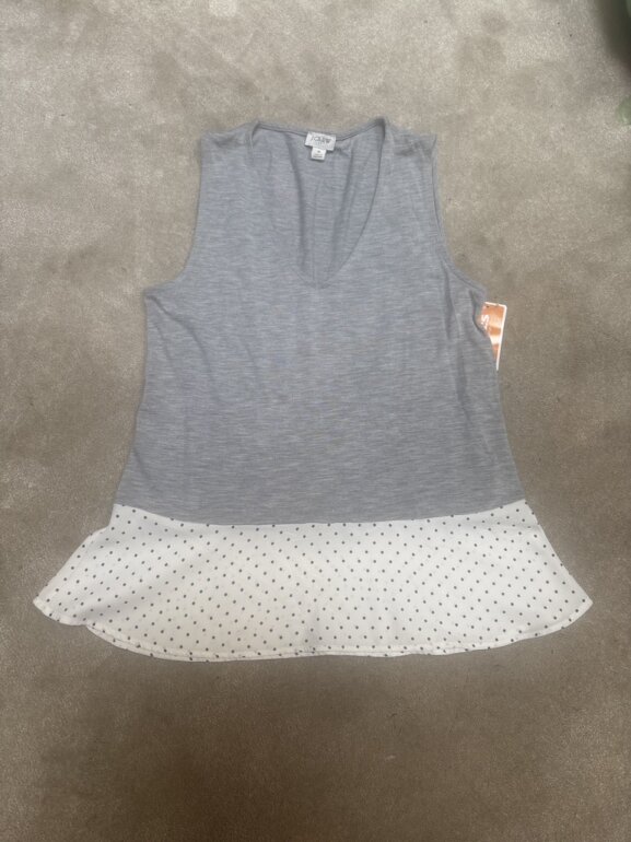 Blusa J.Crew sin mangas en tono gris suave con detalle inferior tipo doble capa en blanco con mini lunares que le da movimiento y un twist moderno.