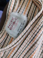 Blusa- hombliguera con estampados de rayas color naranja, blanco y verde. Sin detalles.
