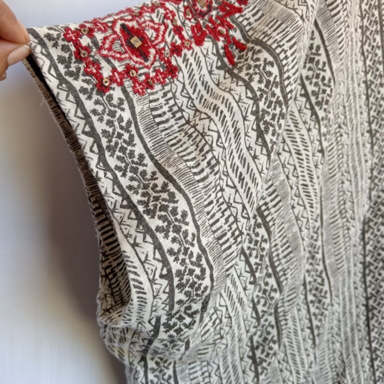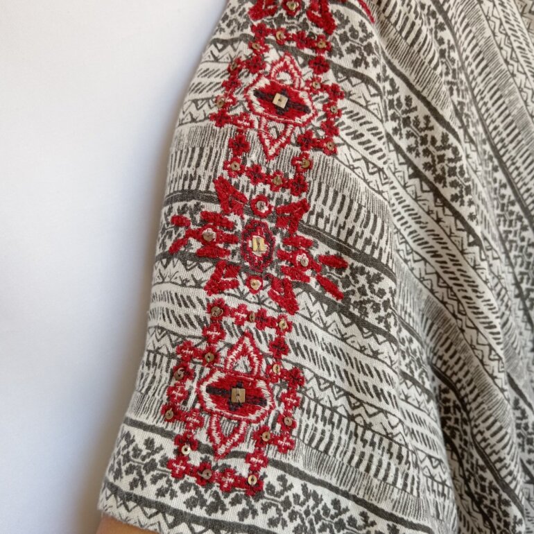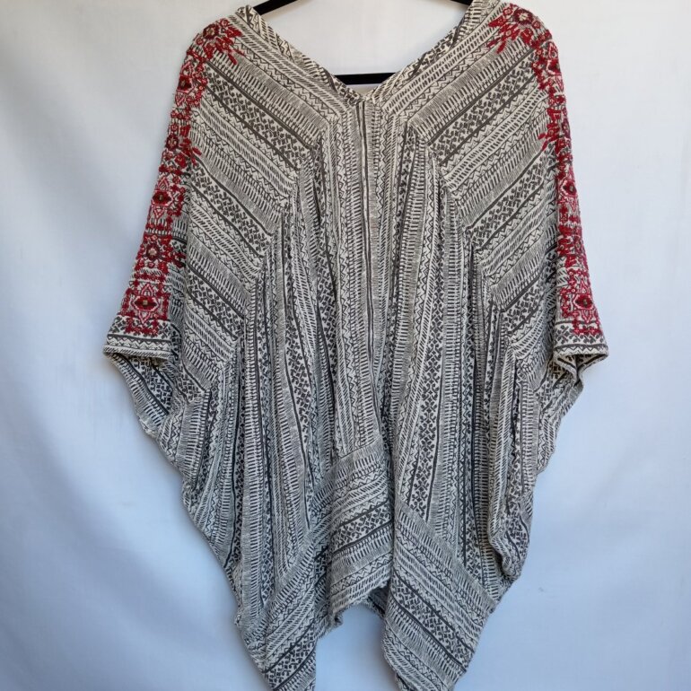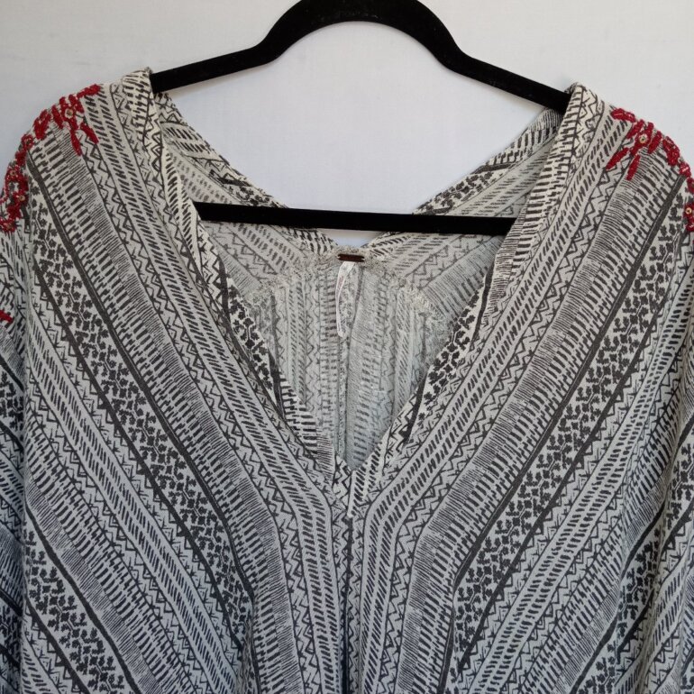 Vestido/poncho fluido Oversize con bordado rojo y un moderno estampado negro. Bonito escote en V, ¡puede quedar hasta una talla grande! Ideal para usar sobre un traje de baño. ¡Perfecto para primavera/verano!