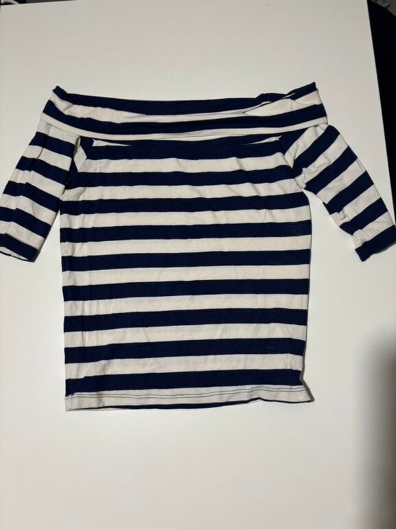 Blusa a los hombros elástica, pegada talla S a los hombros marca Studio F, manga a medio brazo, presenta un ligero detalle de desgaste.