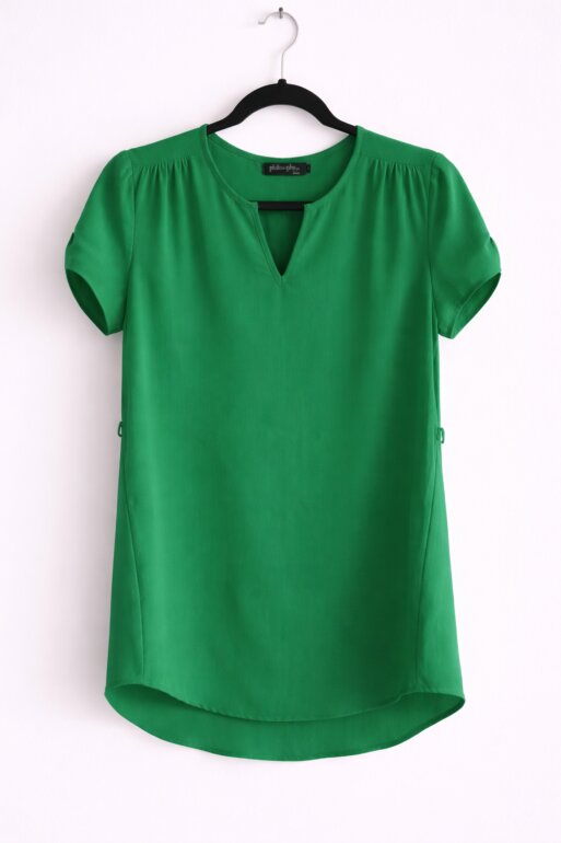 Blusa color verde, de manga corta y cuello en V, con diseño sencillo y elegante que la hace muy fácil de combinar. Su tela ligera y fresca tiene una caída fluida que favorece la silueta y brinda comodidad durante todo el día.