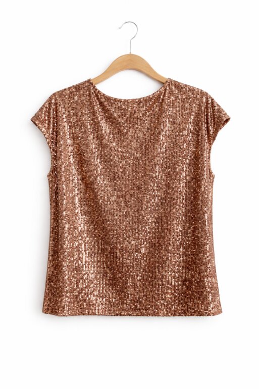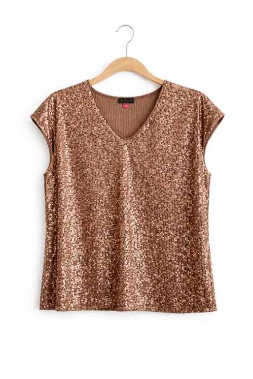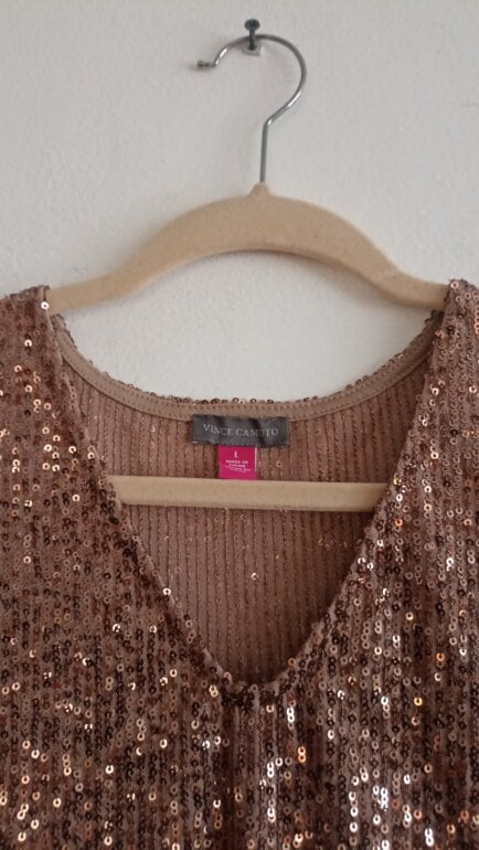 Blusa elegante color dorado/rose gold con lentejuela completa ✨ Escote en V y manga corta. Ideal para fiesta, evento o look glam. Talla L. Excelente estado.