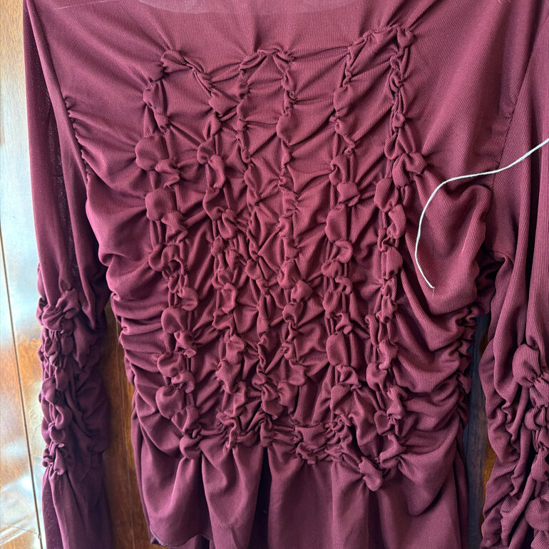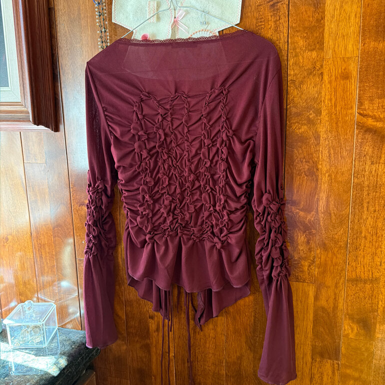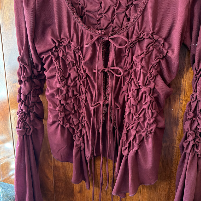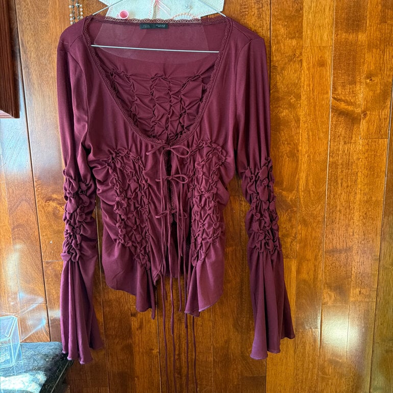 Blusa de manga larga tipo campana, con listones al frente para cerrar.
