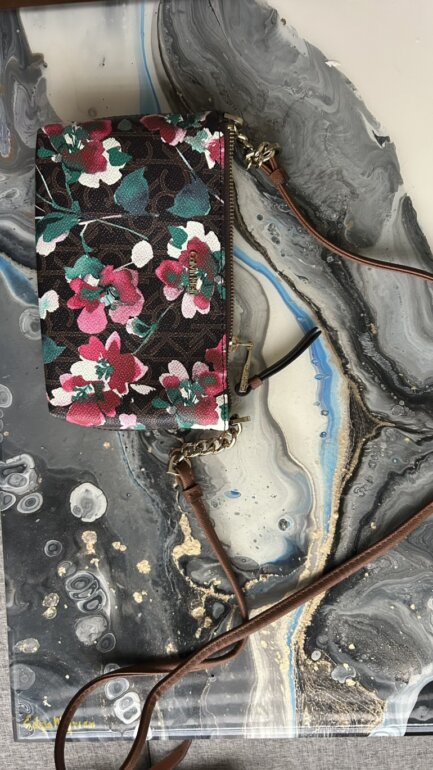 Bolsa de estampado floral, crossbody tamaño chico. Correa color café, estampado de colores rojo, verde, blanco y rosa. Nunca usada, en perfecto estado.