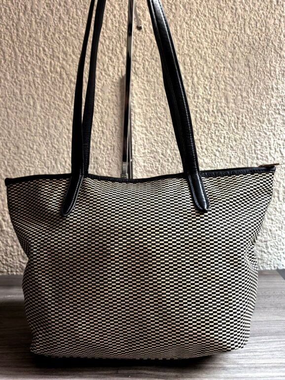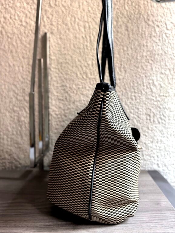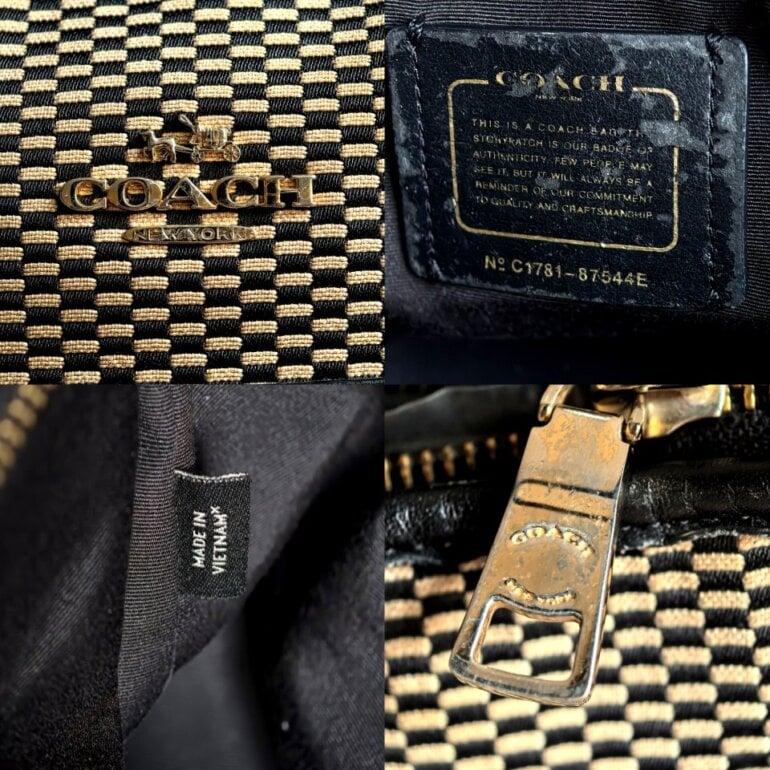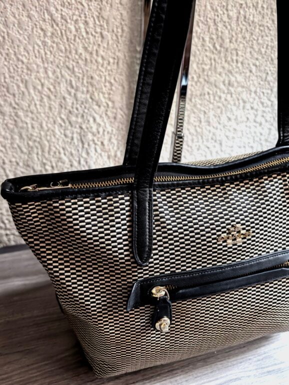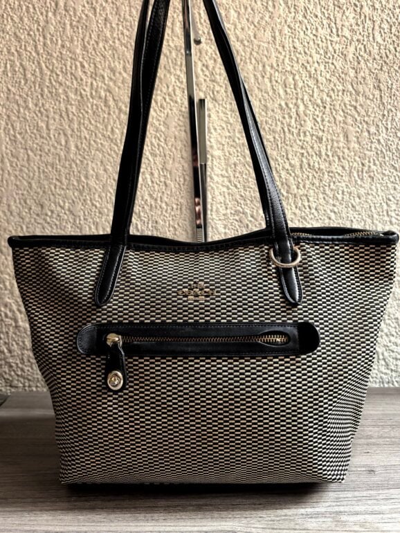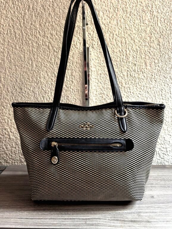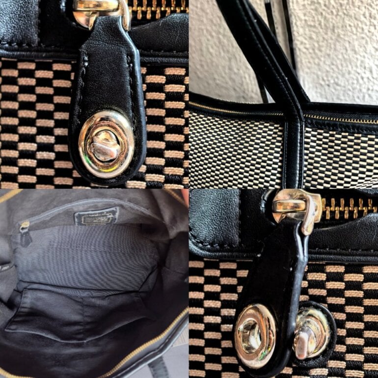 Bolsa Marca Coach en excelente estado, tejito trenzado bicolor, cierre frontal con broche clásico de seguridad para evitar aperturas inesperadas, cierre principal grabado, excelente estado, falta una leve limpieza en la. Parte interna y tiene leve desgaste en la placa interna de cuero donde viene Credo, sin embargo es legible número de Serie de la bolsa, en tienda oscila precio entre 7,300 y 7,800