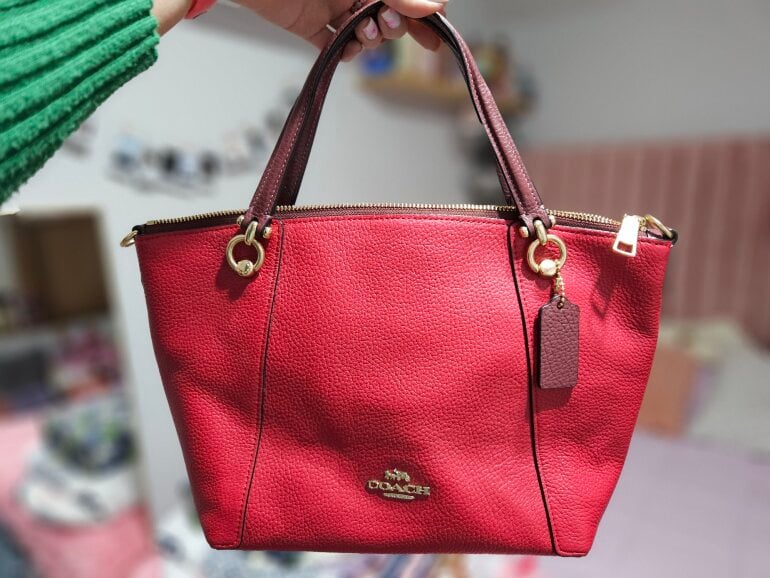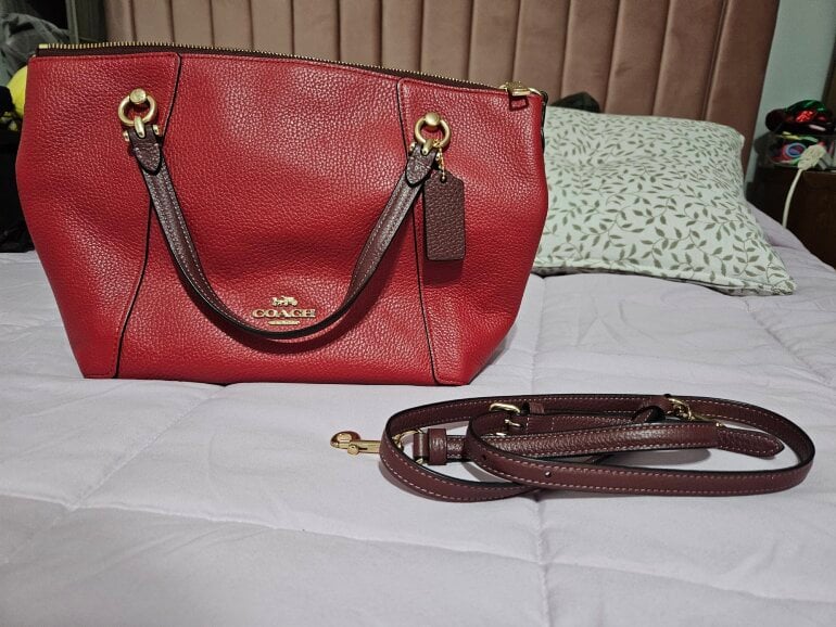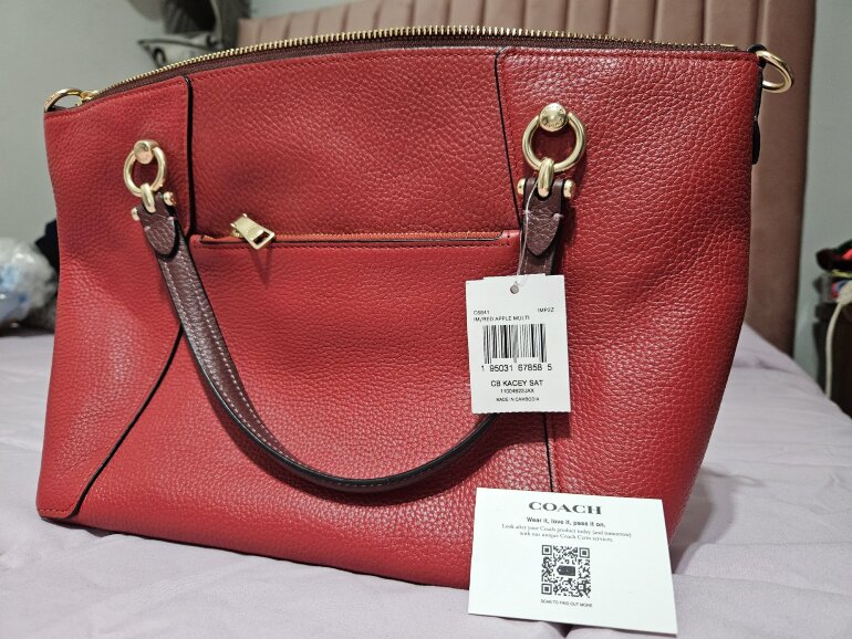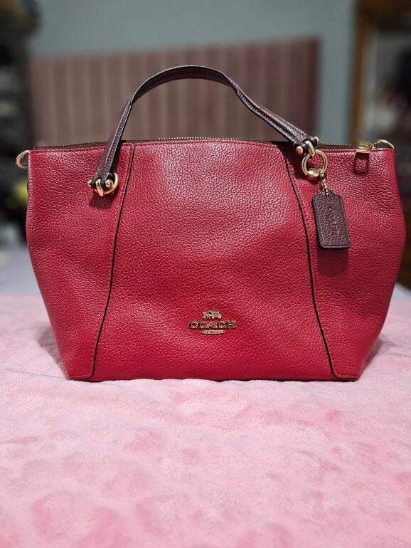 Bolsa de mano Coach 100% original, comprada en USA (tengo ticket original de la compra). Es color rojo quemado, en las fotos se ve un poco más color cereza por la luz. Tiene correa que puede quitarse o ponerse para usarla cruzada. Es amplia y el tamaño ideal para uso diario. Medidas largo parte inferior: 25cm, alto: 23cm, largo en la parte superior: 35cm, ancho: 10 cm.