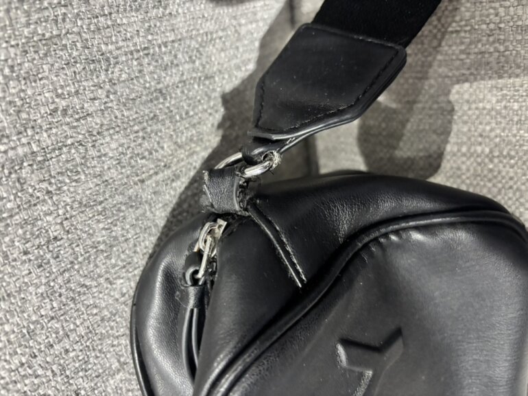 la parte en donde se agarra el cinturón está desgastada, se ve un poco rota. Tiene solución. En la cuarta foto se muestra