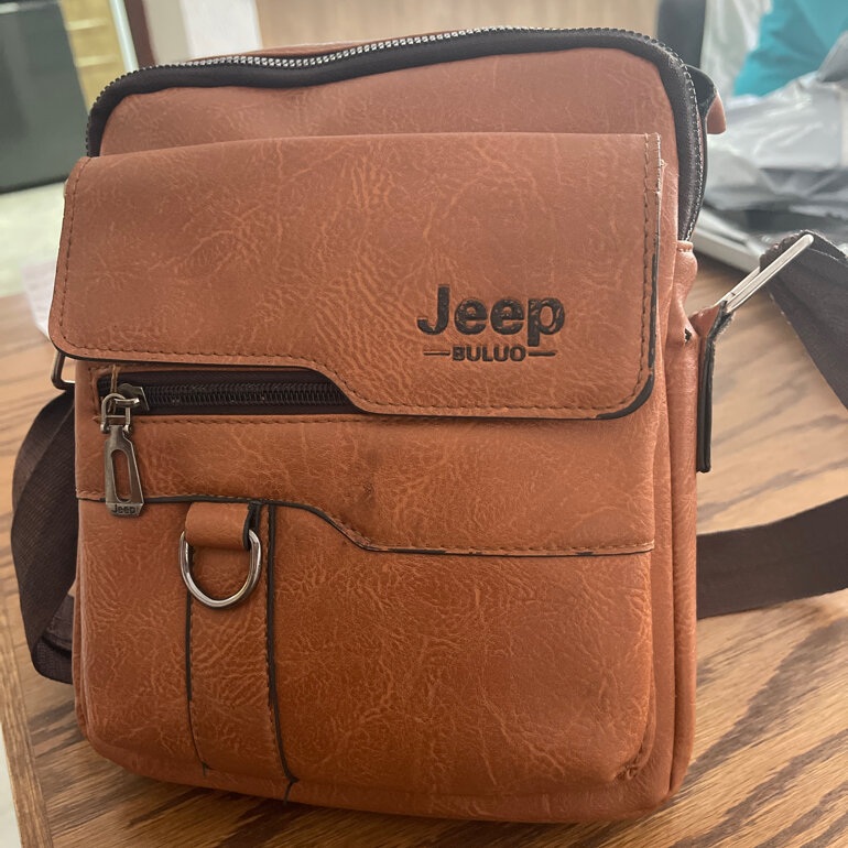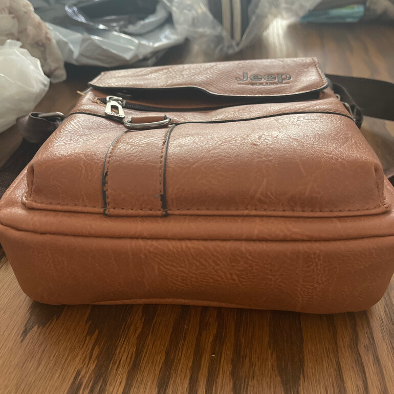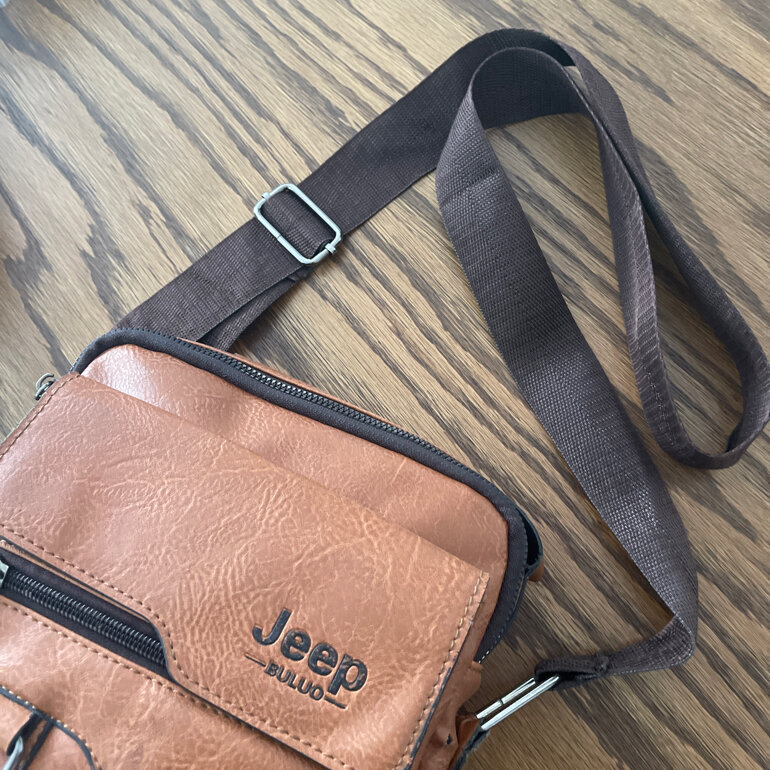 Mariconera de Piel café Jeep, con 30 cms x 30cms x 7cms 4 bolsitas con cordón