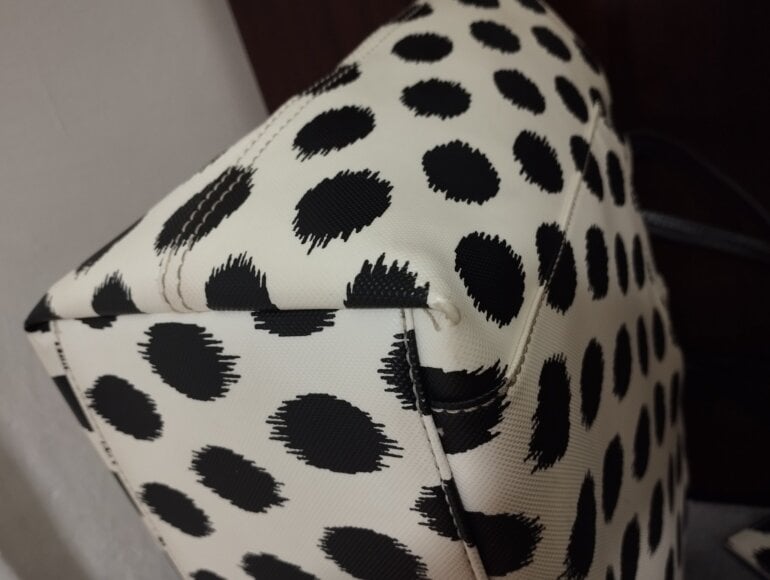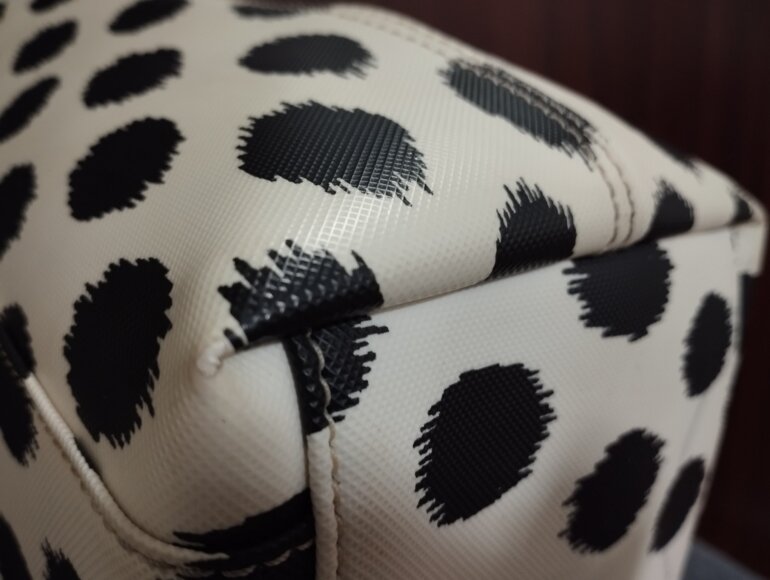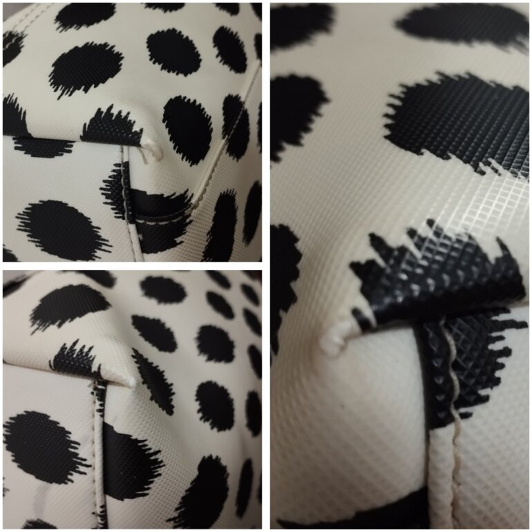 Linda tote. Medidas 38 ancho superior, 28 ancho de la parte inferior, altura 26 y 13 de profundidad. Asas de piel no rotas ni descarapeladas, no cuarteadas desgaste normal. Detalles en esquinas casi imperceptible por el color de la bolsa, ligera mancha en la parte inferior (donde se sostiene). El diseño luce muy bien, si tienes dudas pregunta 😉