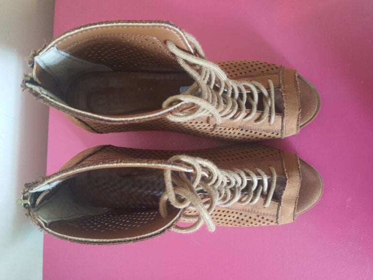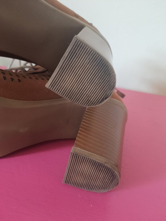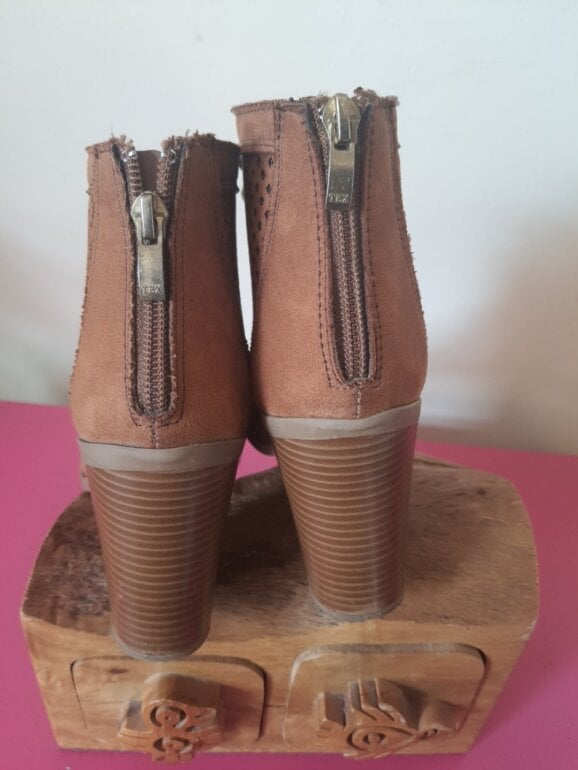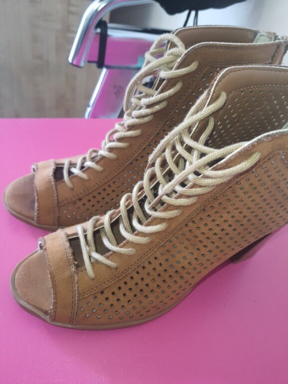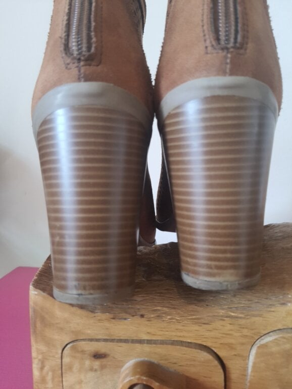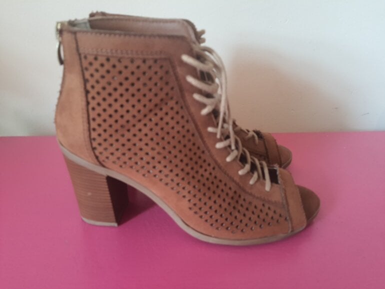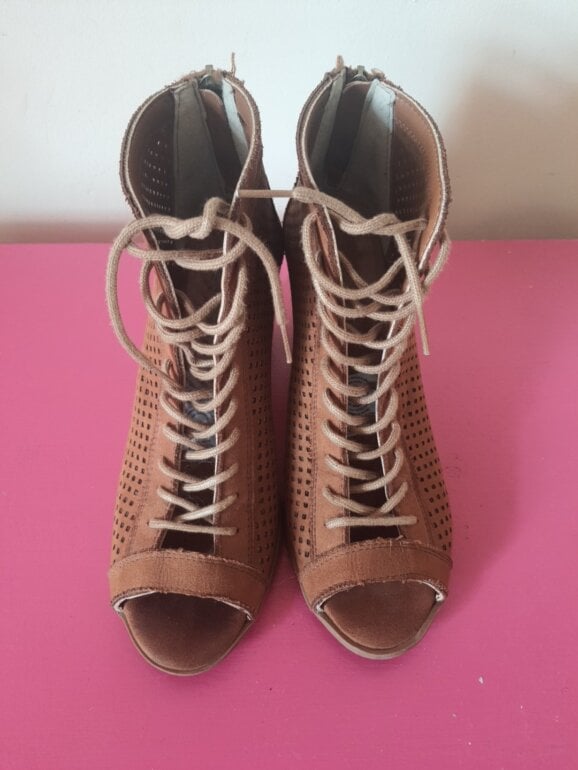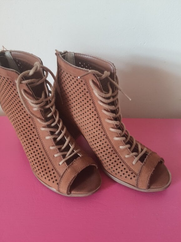 Botas camel punta abierta y agujetas tacón 8 cm usasas solo un par de veces, acabado imitación gamuza, ideales para usar con falda. Eleleva tus looks con estilo diferentes.