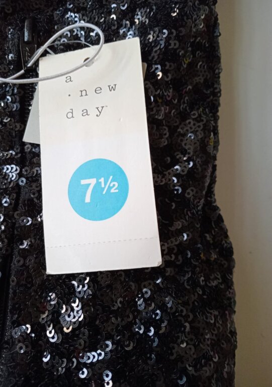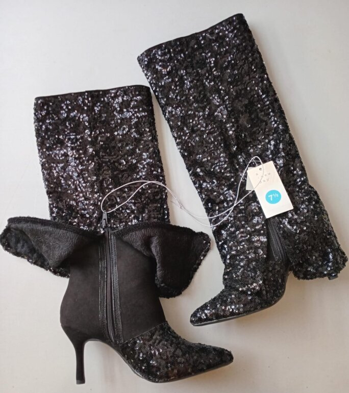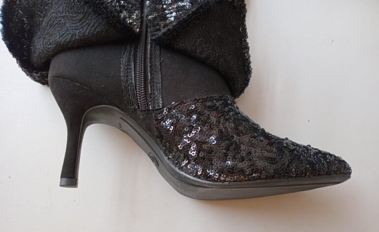 Botas de punta, talla 4.5, color negro con lentejuelas, 8 cm de tacón, tiene cierre.