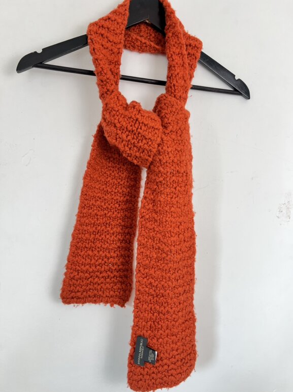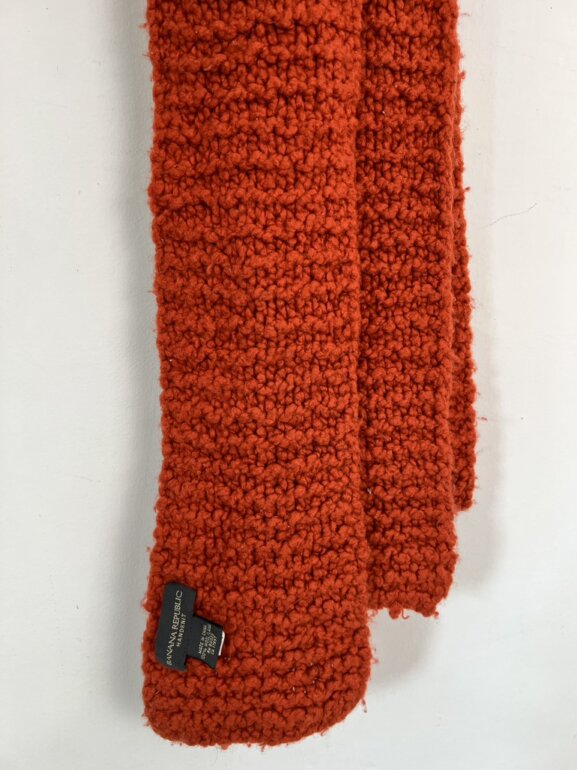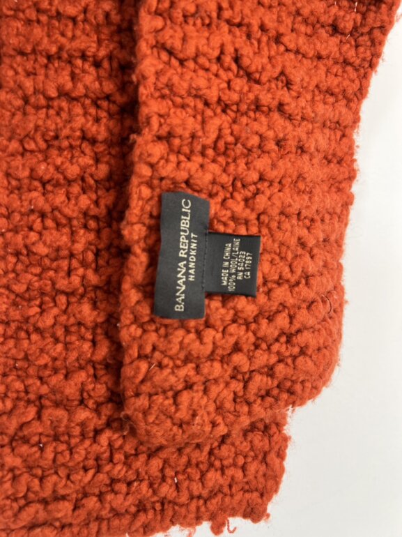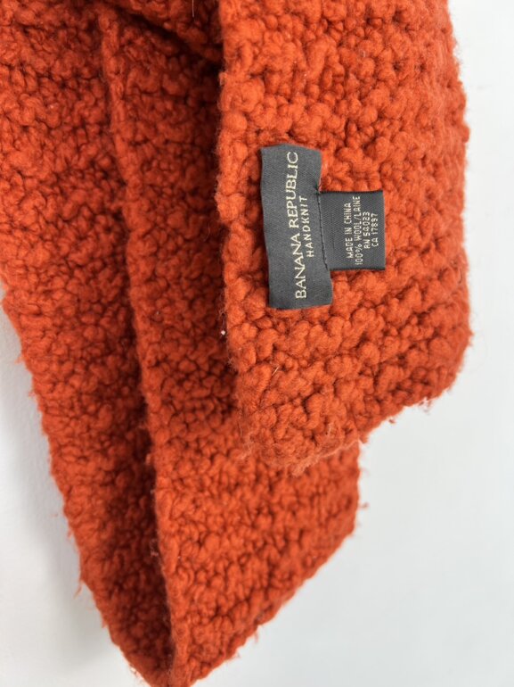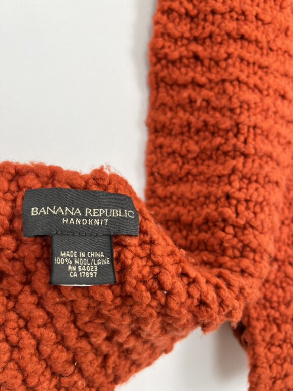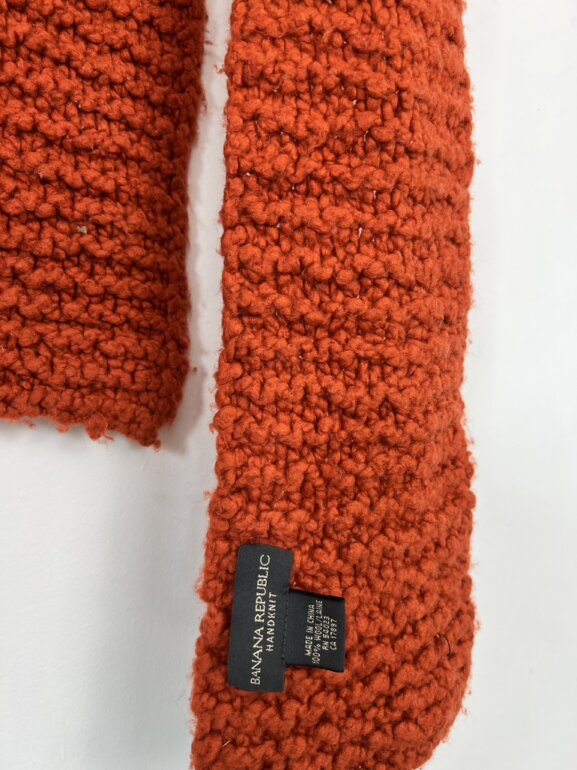 Bufanda Banana Republic tejida a mano en lana 100%. Tejido muy grueso que aporta abrigo real y textura marcada. Diseño amplio y versátil para distintos estilos de uso. Ideal para climas fríos y looks casuales o urbanos. Medidas: largo 188 cm, ancho 12 cm.