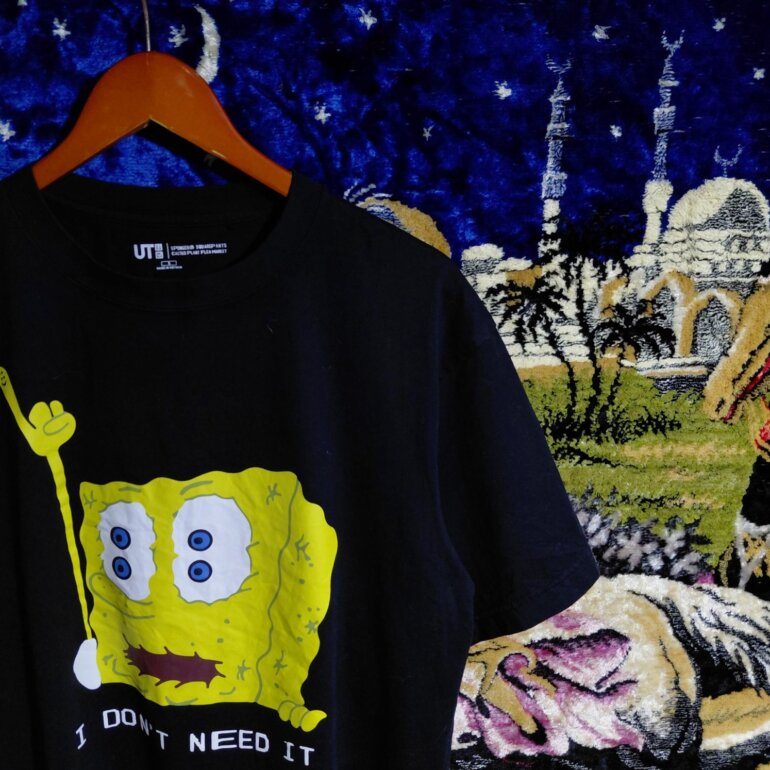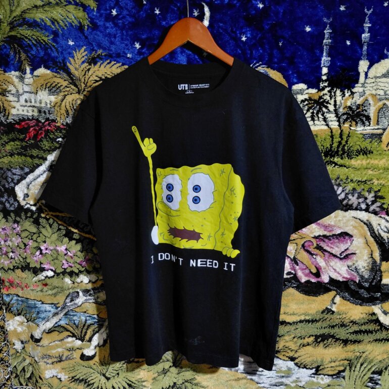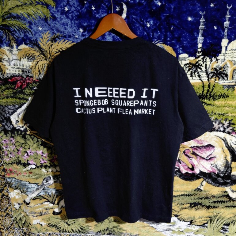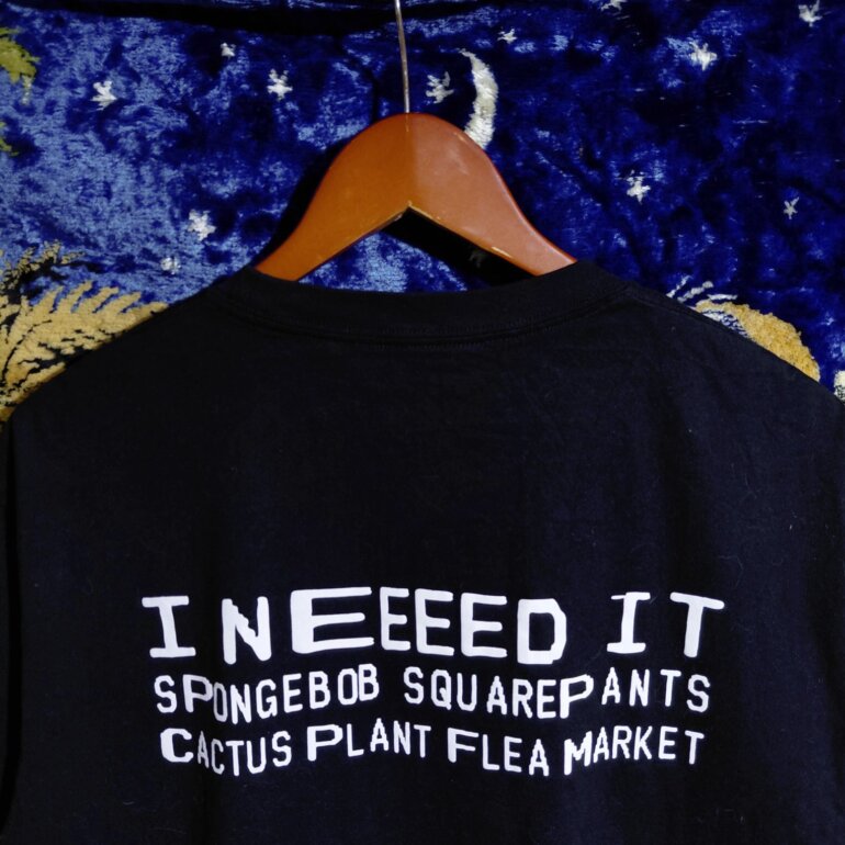 SpongeBob SquarePants x Cactus Plant Flea Market (CPFM) x Uniqlo UT. Lanzada como parte de una colección especial, la prenda presenta una ilustración de Bob Esponja con el estilo característico de CPFM y estampado en PUFFY print.