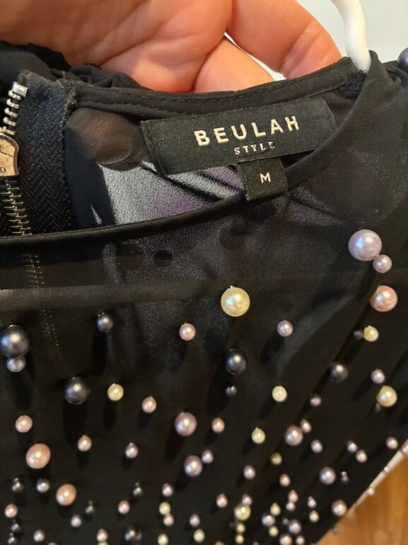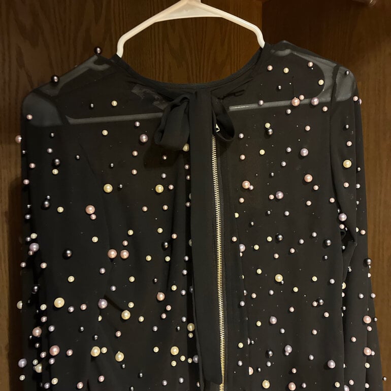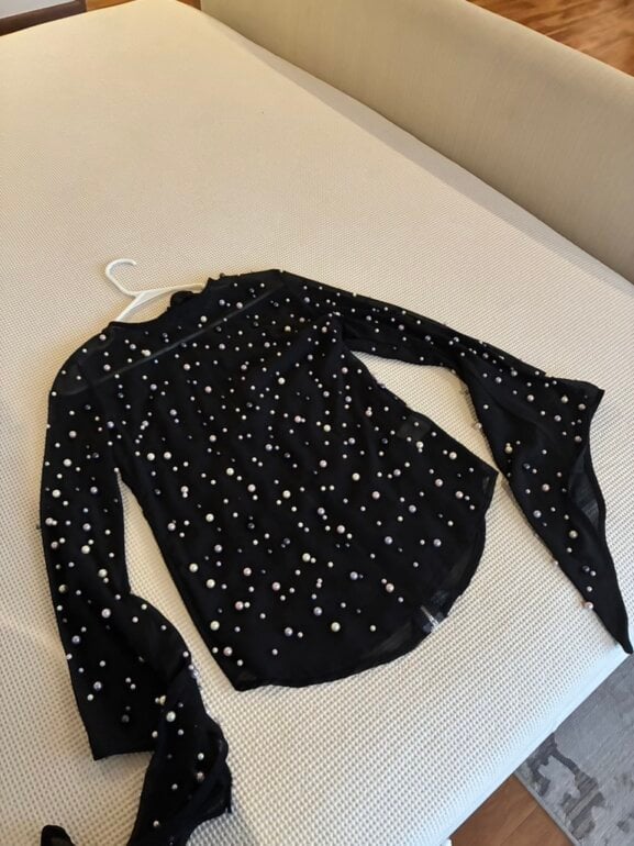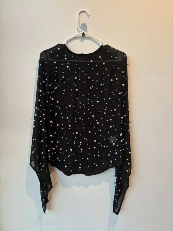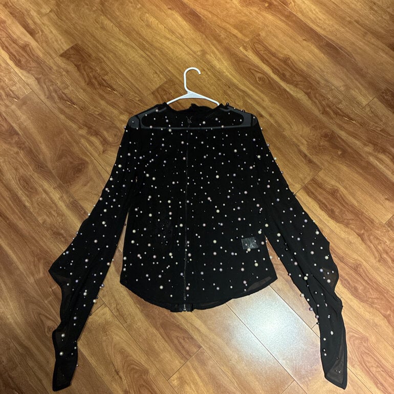Camisa transparente de poliester llena de Perla’s de Cristal (no son de esas feas plasticas) las mangas terminan en pico. El cierre corre por toda la esplada y trae Liston para hacer moño