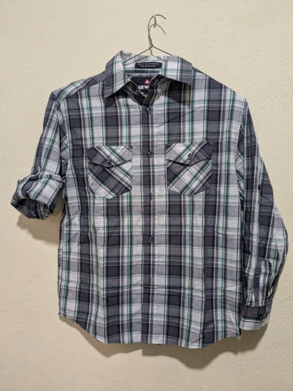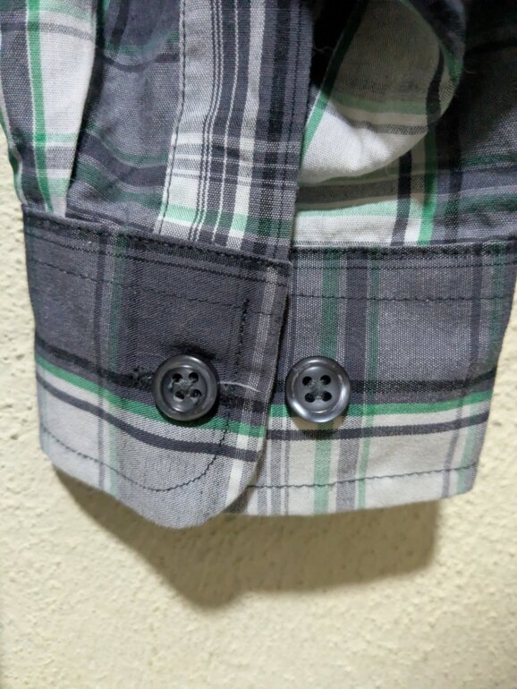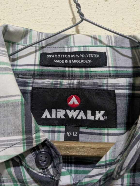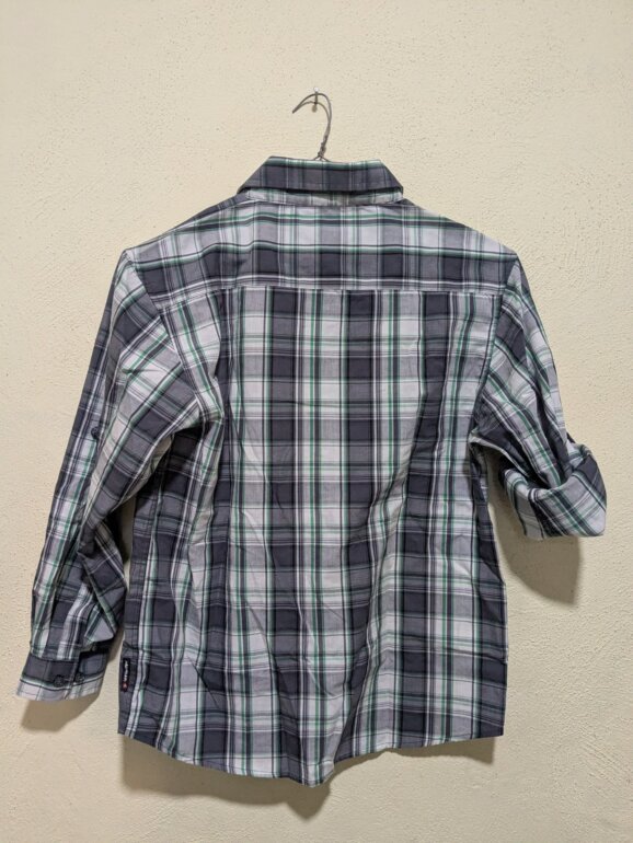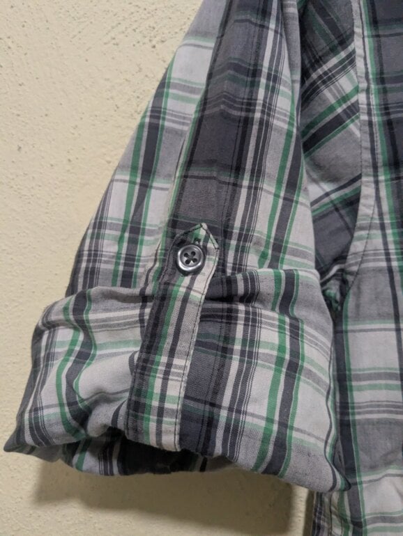 Original Airwalk de manga larga, con un diseño a cuadros en tonos gris, negro y verde. Está confeccionada en una mezcla de 55% algodón y 45% poliéster, lo que la hace ligera, resistente y cómoda. Cuenta con dos bolsillos frontales con botón y cierre frontal de botones. Las mangas se pueden doblar y asegurar con botón, permitiendo usarla como manga larga o manga corta según el estilo o el clima.