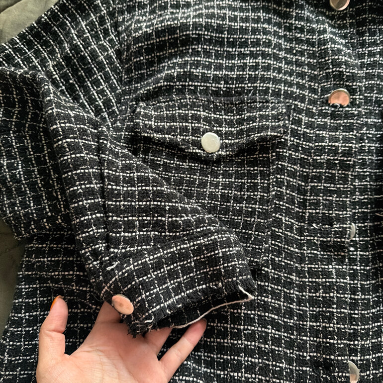 Es mas gruesa que una camisa y mas delgada que yna chamarra. Es bastante ligera y se cierra abrochada, tiene un acabado como descocido en la manga y por debajo.