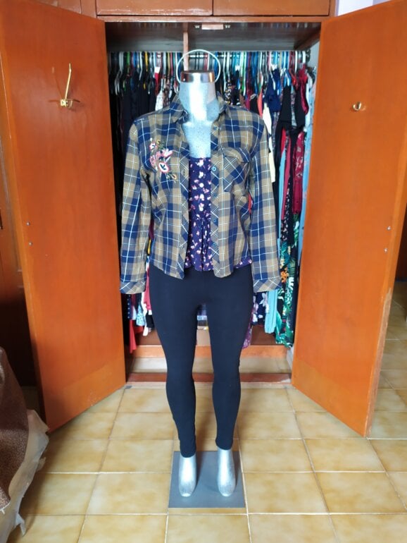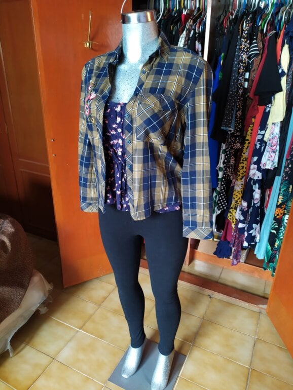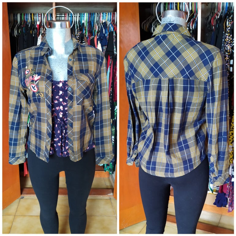 Camisa a cuadros Bershka talla XS pero puede quedar a S incluso M, perfecto estado. Puedo hacerte un paquete con las prendas de tu interés.
