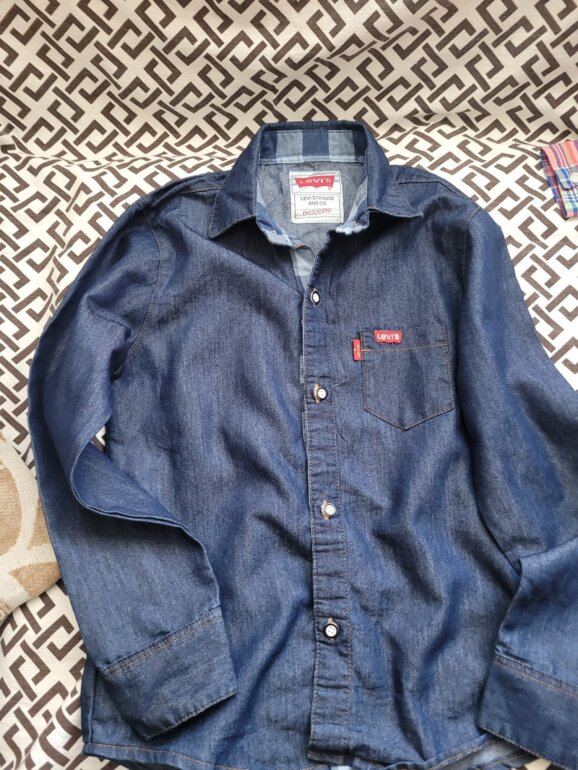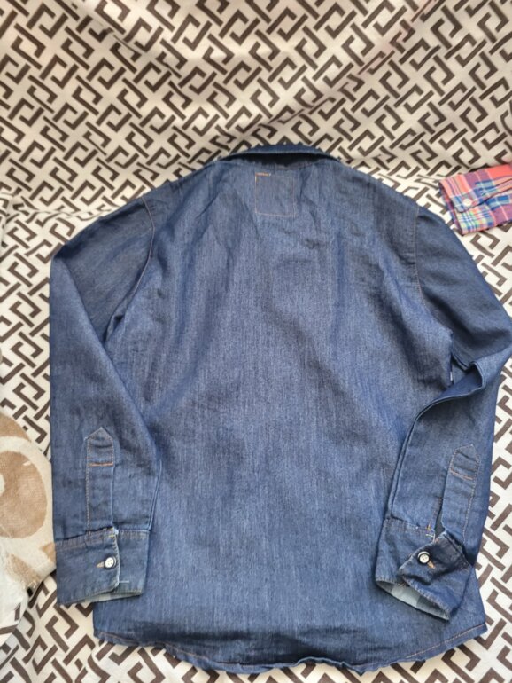 Camisa de mezclilla obscura. Sin detalles, está tan cuál las imágenes. Sólo se usó una vez para un bailable.