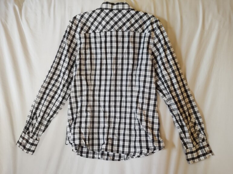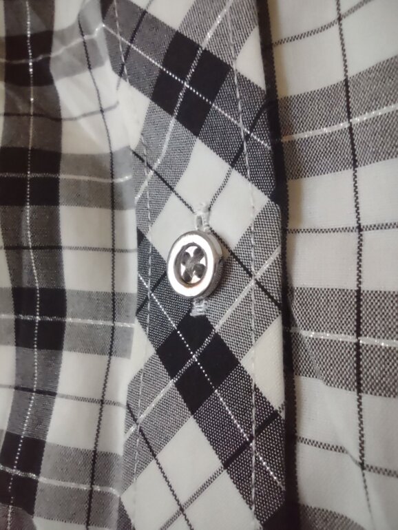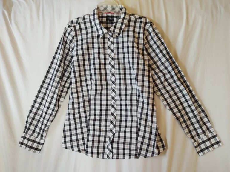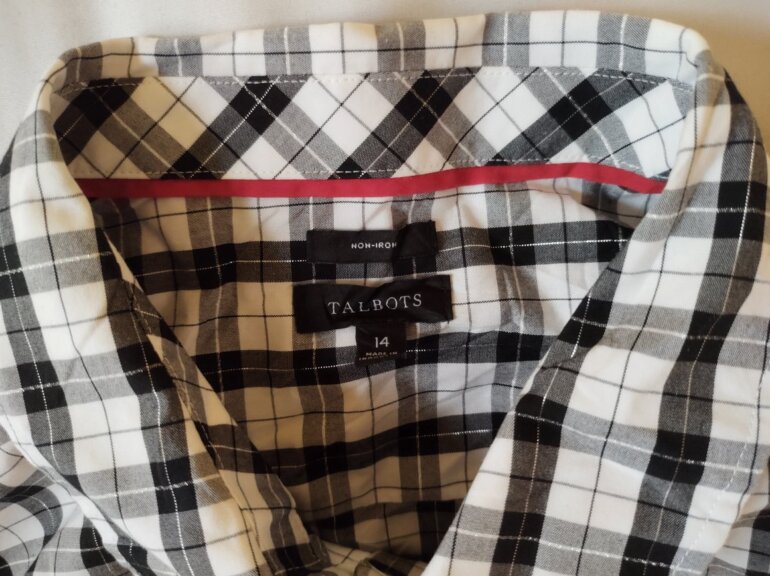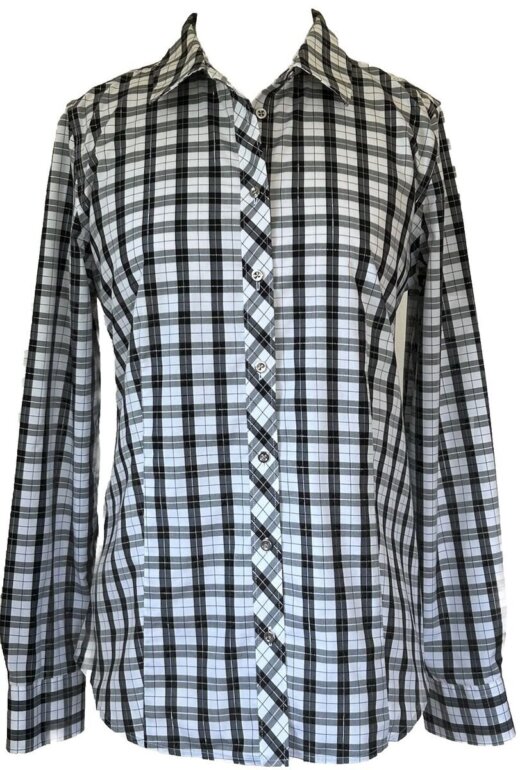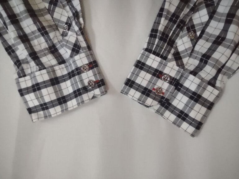 Clasica camisa elaborada en motivo tartán blanco y negro con hilo plata entre las líneas gruesas. Fácil de planchar, elaborada en algodón y poliéster. Dice talla 14, mide hombro a hombro 42 cm, axila a axila 56 cm, largo total por la espalda 66 cm, compara con una prenda tuya.