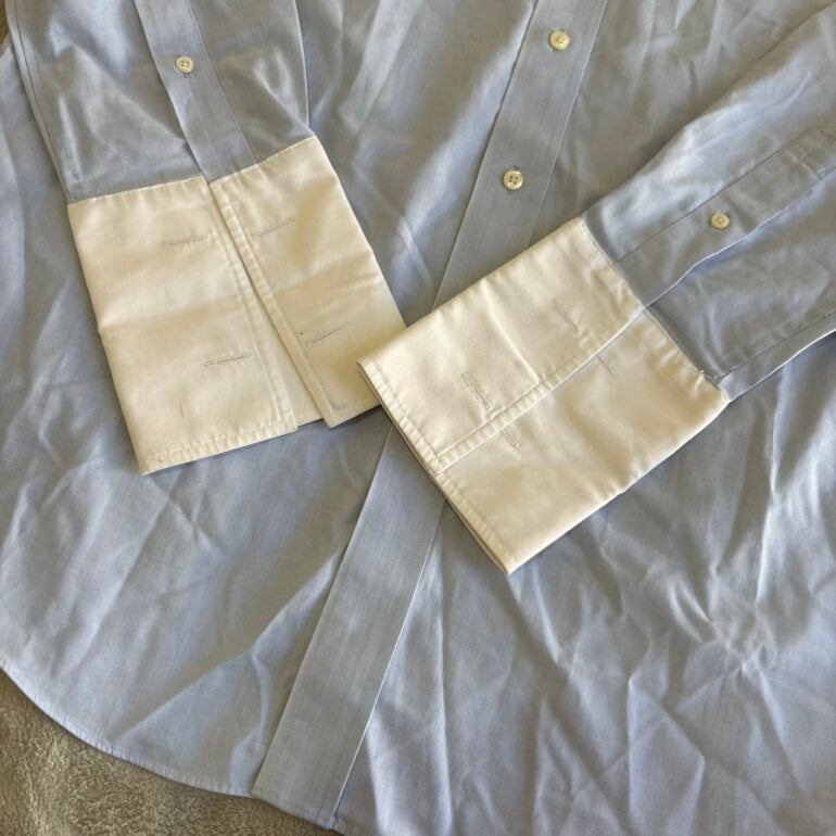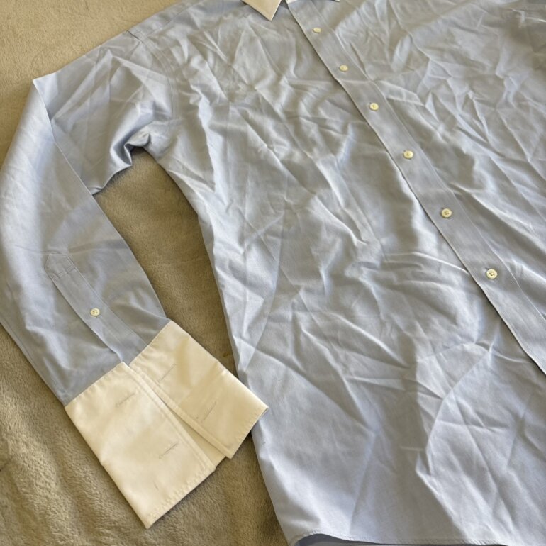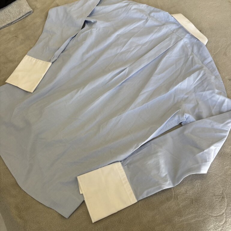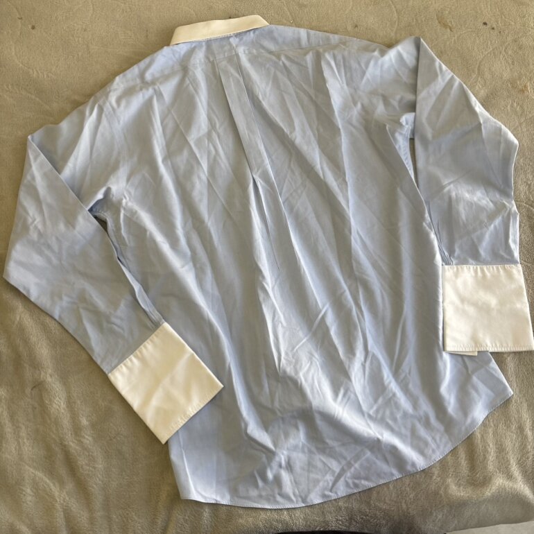 Sin detllaes. Muy bonita es formal y cuenta con puños para mancuernillas. Está súper padre. Color azul cielo