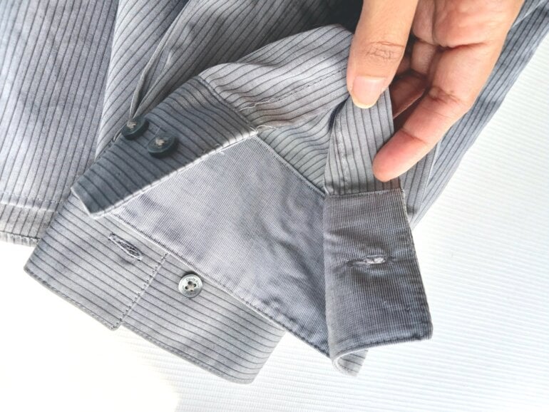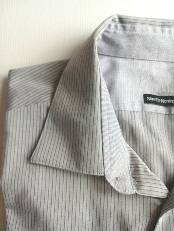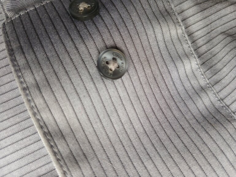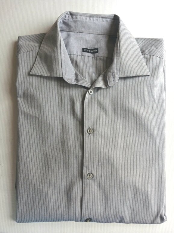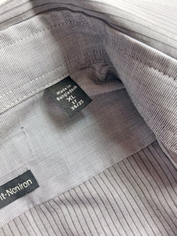 Camisa gris a rayas, textura ligeramente satinada con un diseño de rayas finas que dan un toque de elegancia. Talla G corte slim. Le tuve que quitar la etiqueta para pasar aduana, pero los botón traen la marca