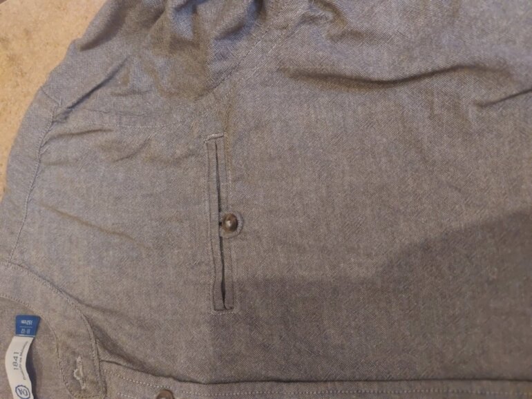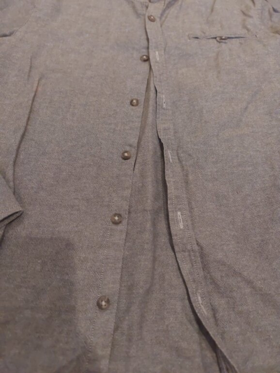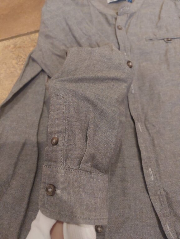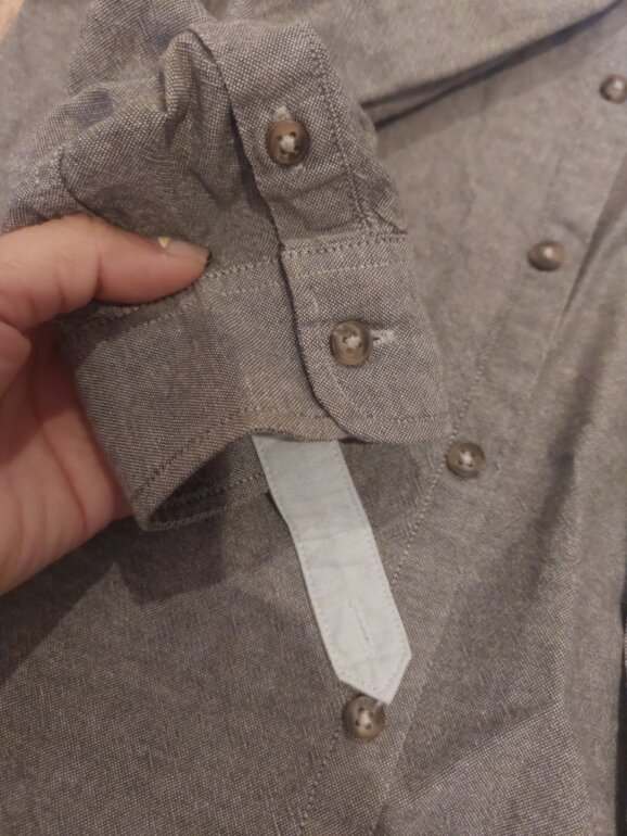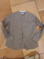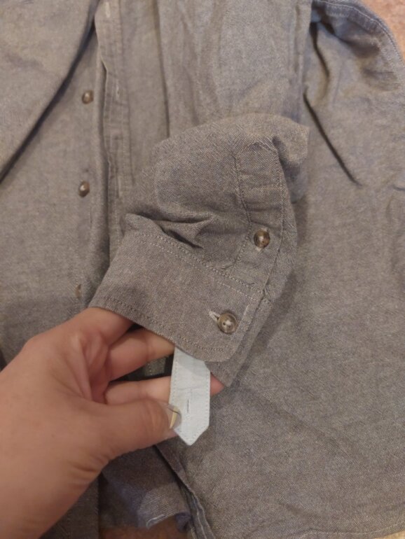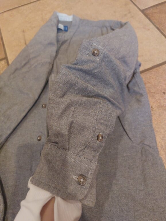 Camisa de cuellos redondo, manga larga, gris oscuro con bolsillo al frente y agarre para acortar mangas dice talla 11 pero esta reducida, queda a 8