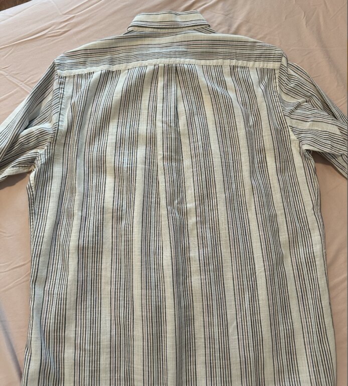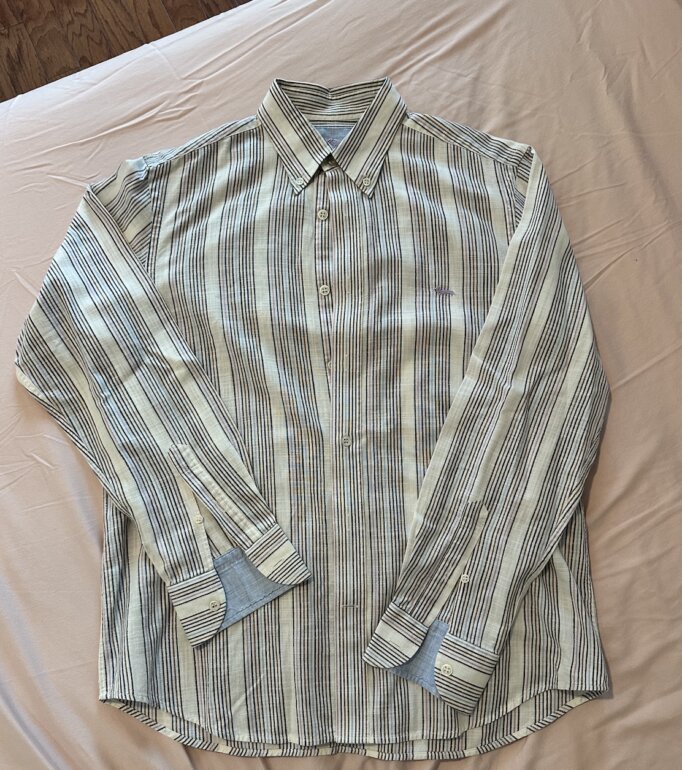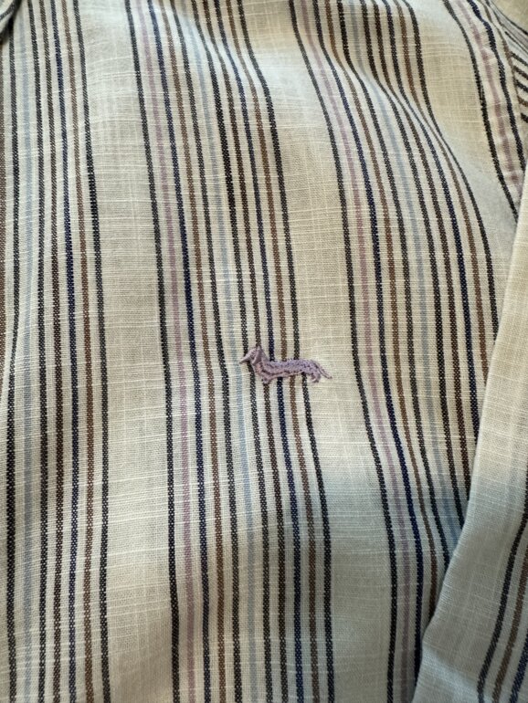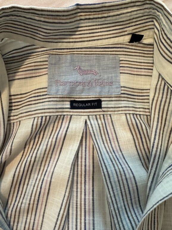 Talla: L. Marca: Harmont & Blaine. Línea/modelo: Regular Fit. Camisa de manga larga con diseño de rayas verticales multicolor (base clara con líneas en azul, café y detalles en lila/rosa). Cuello Button-Down (con botones en las puntas) y cierre frontal con botones. Logo bordado del perrito en el pecho (detalle clásico de la marca). Está casi nueva, de poco uso, muy cuidada y limpia de tintorería.