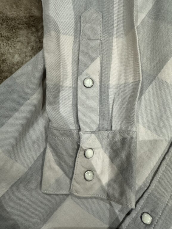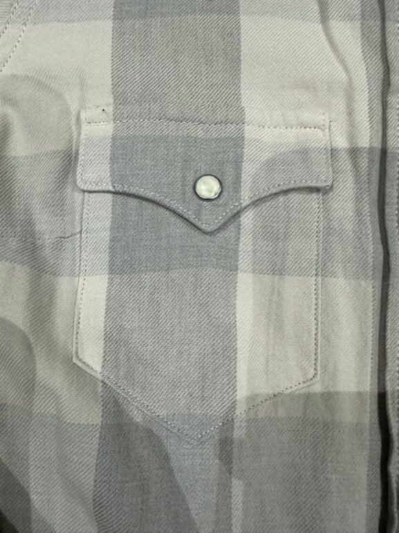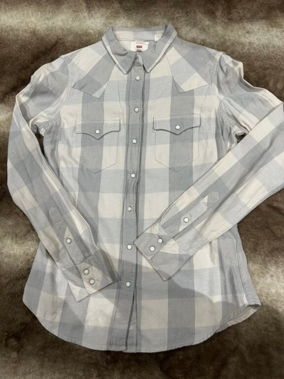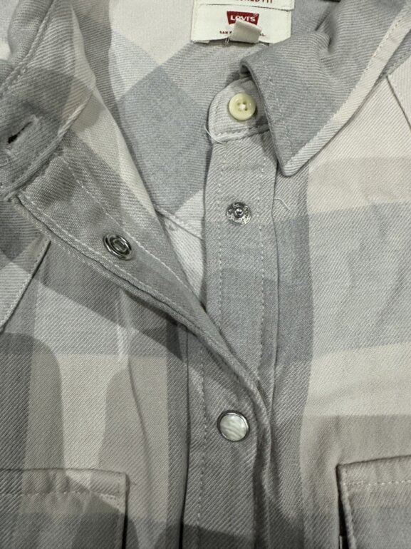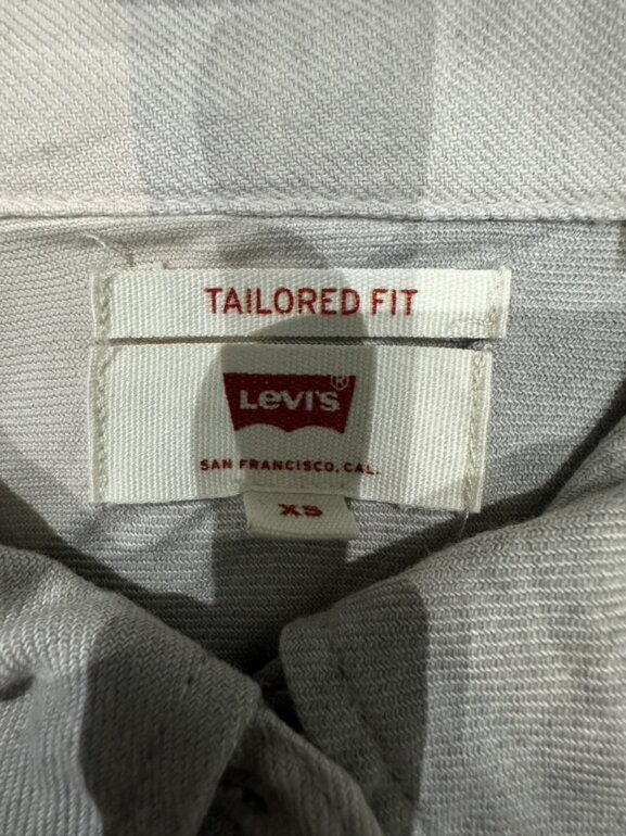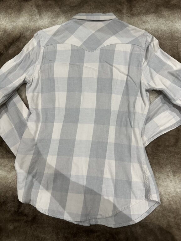 Camisa Levi’s Tailored Fit de manga larga, en tonos gris claro y rosa con estampado de cuadros grandes. Presenta bolsillos frontales con solapa y botones tipo presión, además de puños ajustables. Corte entallado y estilo clásico western, ideal para un look casual o relajado. Talla XS.