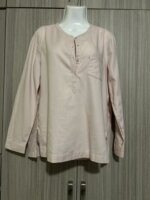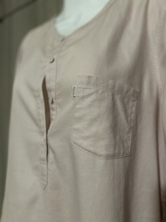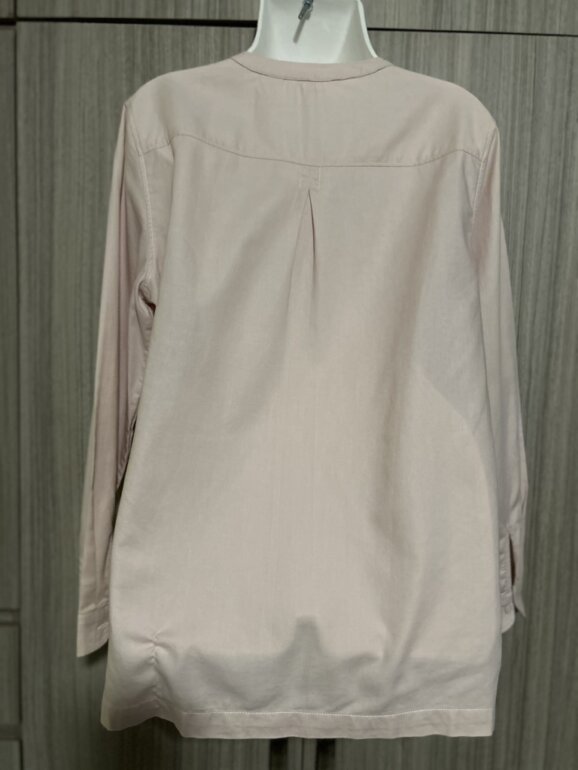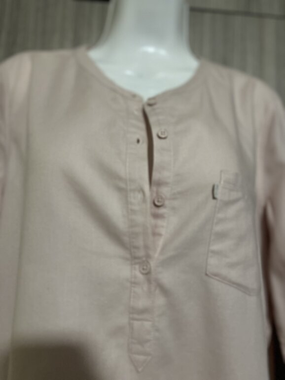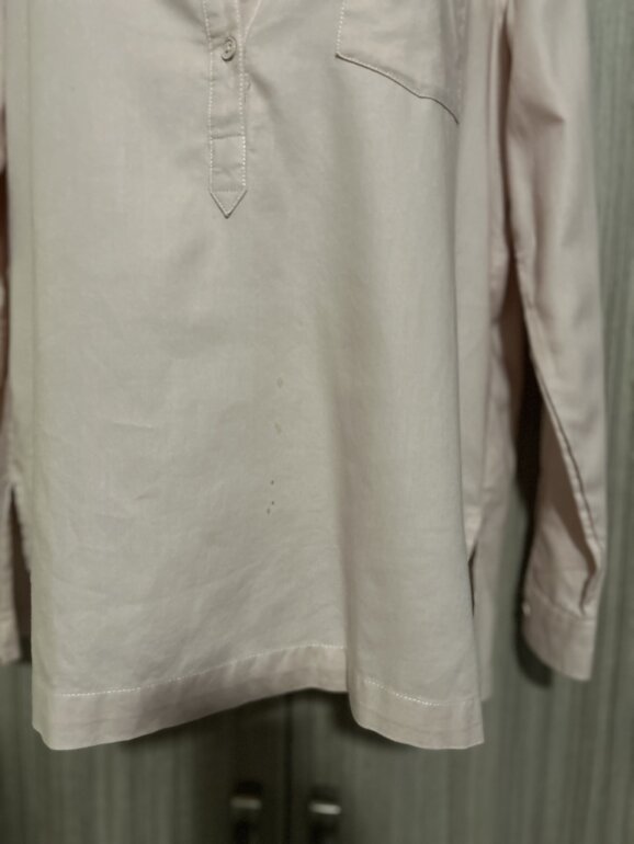 Camisa de algodón, color rosa, claro, con pequeñas manchas color café en la parte inferior