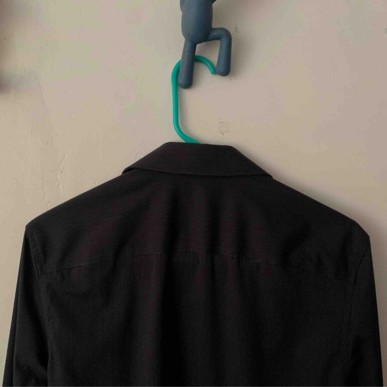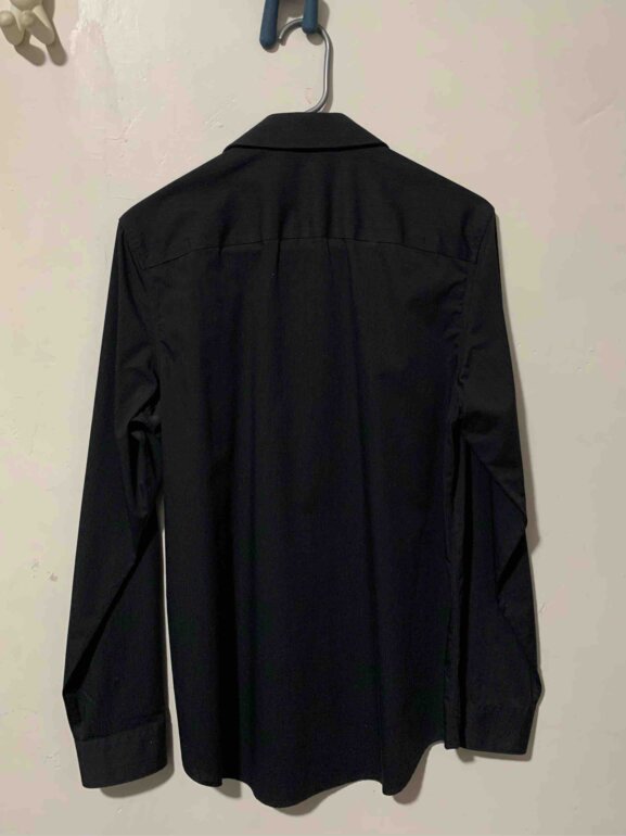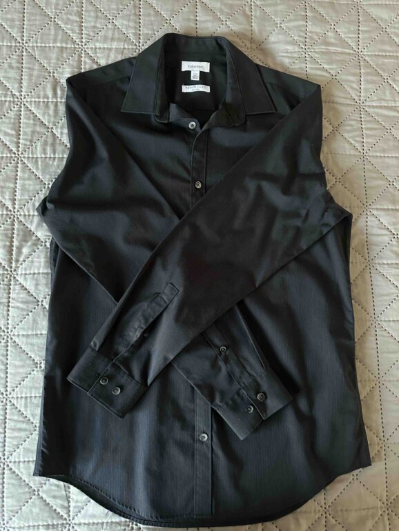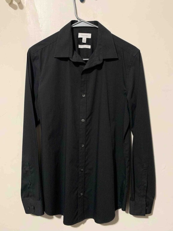 Camisa de vestir color negro de manga larga, marca Calvin Klein, talla chica, corte recto. Sólo se usó una vez, por lo que está en perfecto estado y sin desgaste de ningún tipo. Ideal para lucir bien en eventos especiales o en el día a día. En el puño tiene dos botones para mayor o menor ajuste, además cuenta con dos botones de repuesto. Los botones tienen el nombre de la marca “Calvin Klein”.