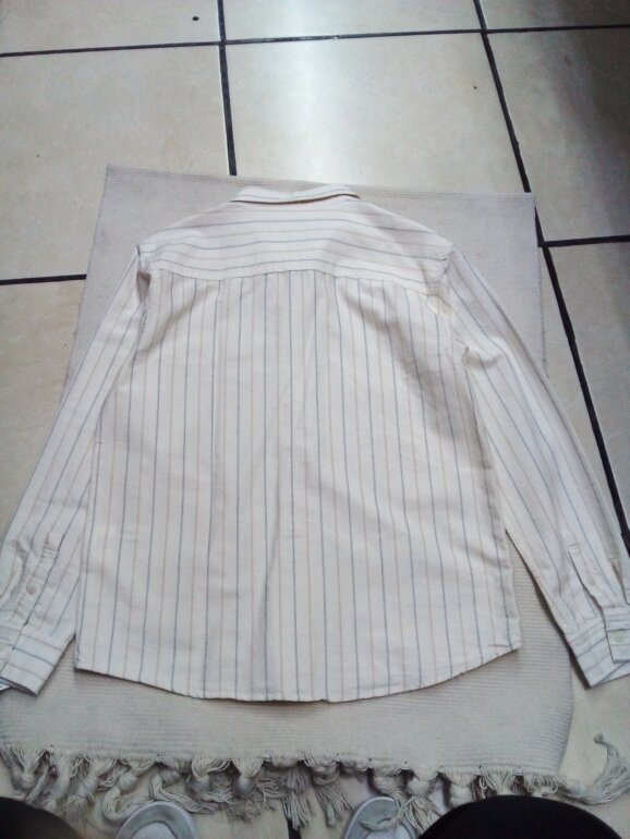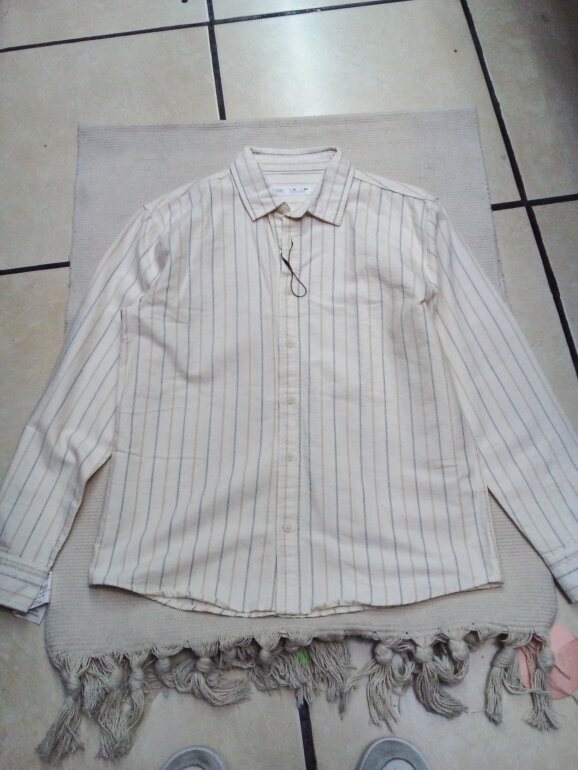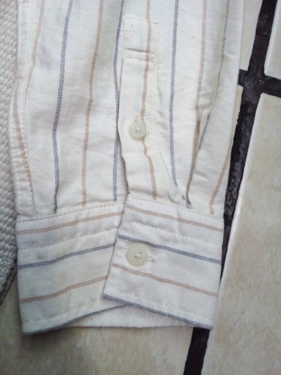 Camisa de franjas en tonos claros , de algodón, la prenda tiene polvo por estar en exhibición, a estrenar sin etiqueta
