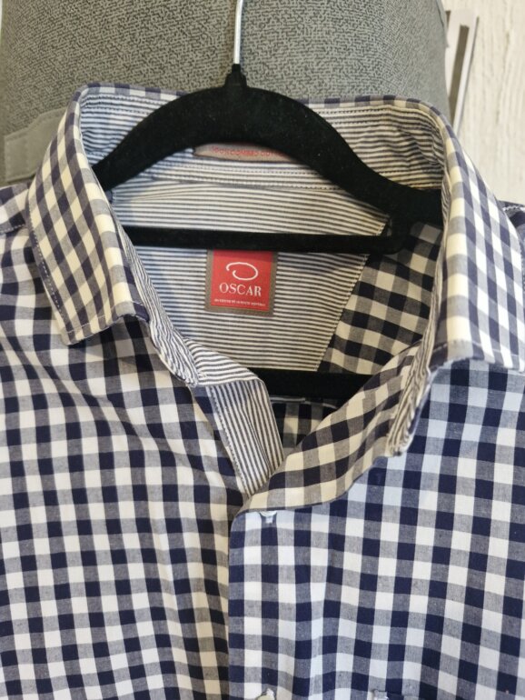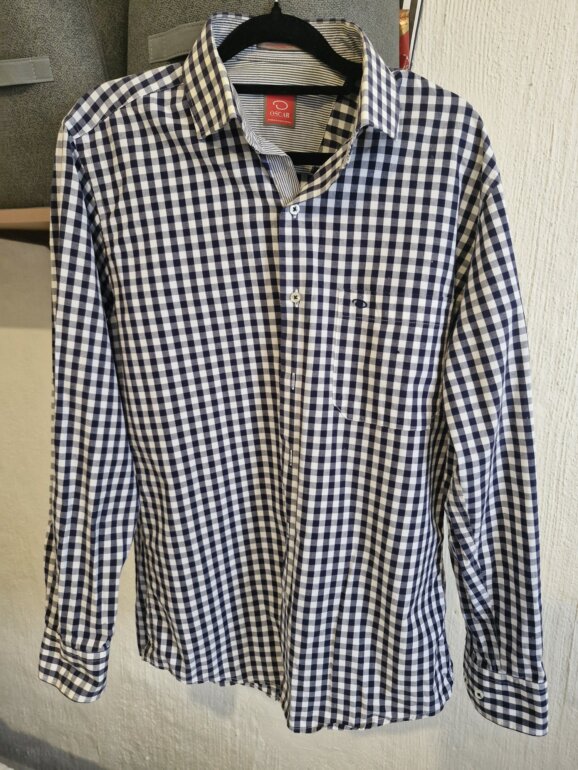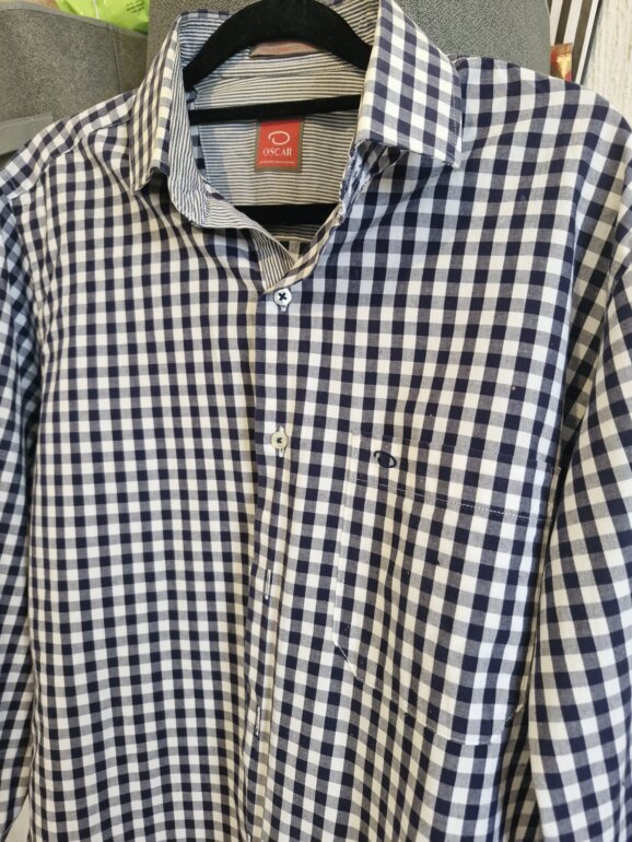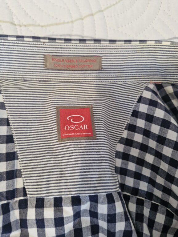 Camisa en muy buen estado marca Oscar de la Renta. Talla 15 1/2 , no viene la etiqueta de la talla ya que se recortó por sensibilidad en la piel pero queda bien para tallas M. Trae unas pequeñas manchidas imperceptibles a la altura del bolsillo que no afectan para nada su uso. Excelente calidad