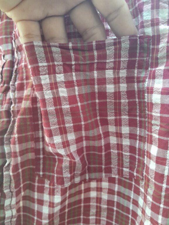 Color: Estampado a cuadros (plaid) en tonos rojo, blanco y detalles en verde olivo.